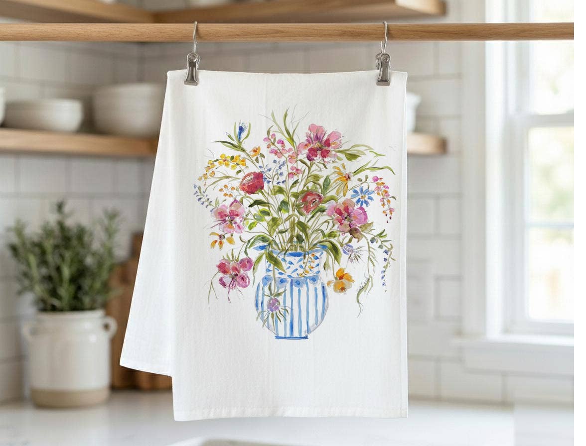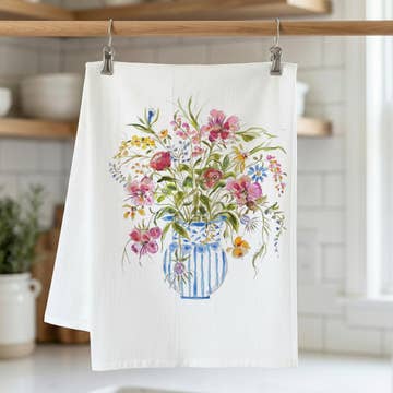 Our premium quality flour sack towel is hemmed on all 4 sides and has a hanging loop for easy display and drying. Highly absorbent, lint free, and very soft. Made of100 % cotton. Measures 27" x 27". Decorated in the U.S.A. BMcVan design.