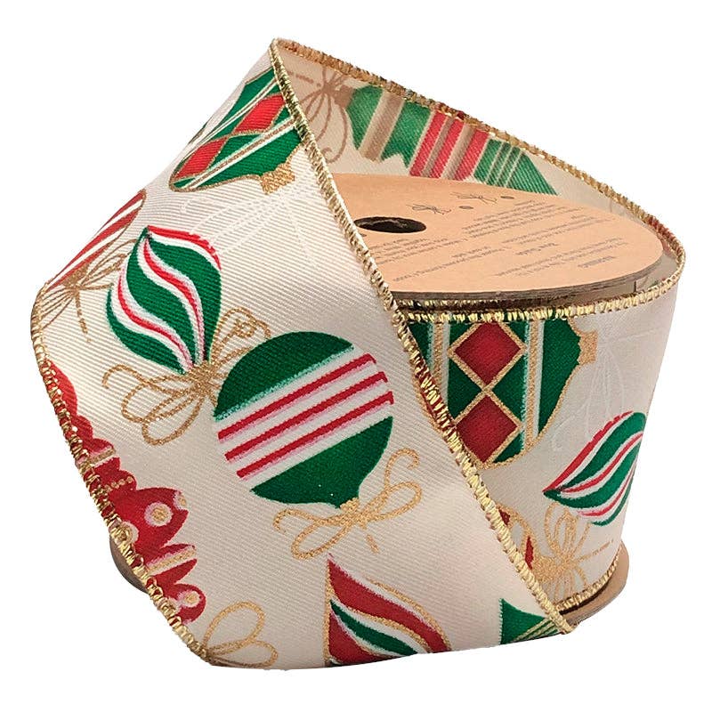 Wholesale 2 1/2" Wired Ribbon | "Holiday Ornament" Antique White/Multi | 10 Yard Roll