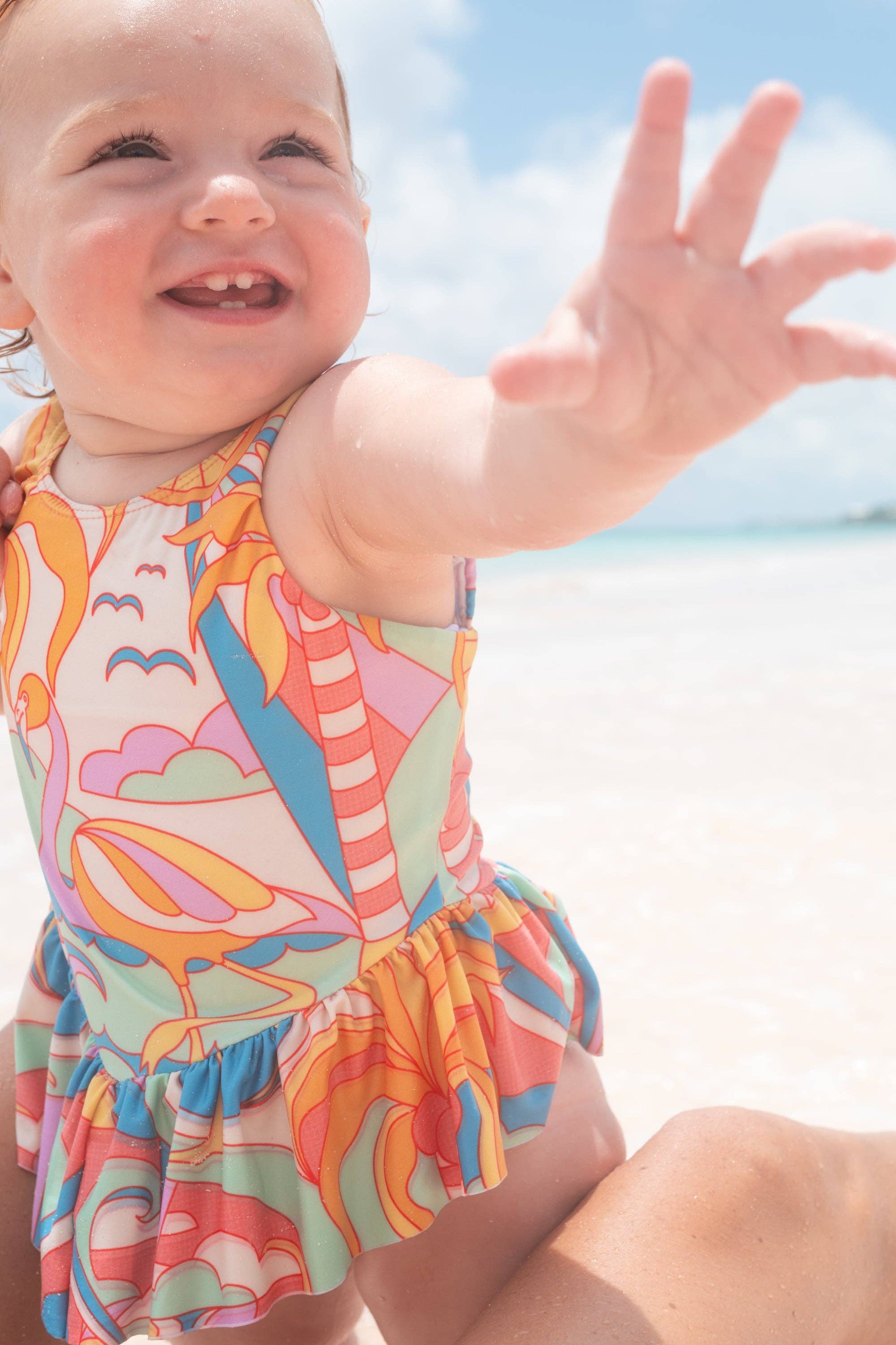Mommy and me in matching swimsuits? Sounds like the dream because it is. Wherever you're headed on your next family vacation, your little 5-star resort princess will love wearing this chic new girls ruffle one piece inspired by mermaid scales and calm Caribbean waters. The kicker? She can match daddy too. Match with mom or dad in any of our swim and resort wear from The Anguilla Collection. Infant sizes through size 2 have diaper-friendly snaps on the bottom of the one piece. Details * Stylish ruffle one piece * Sizes from infant swimwear, to toddler, to little girls * Super-soft, sun-protective fabric with UPF 50+ * 80% Polyester, 20% Spandex * Anti-chlorine and salt-resistant technology to maintain superior shape, color and quality * Ethically made by an all-women-run team in Colombia