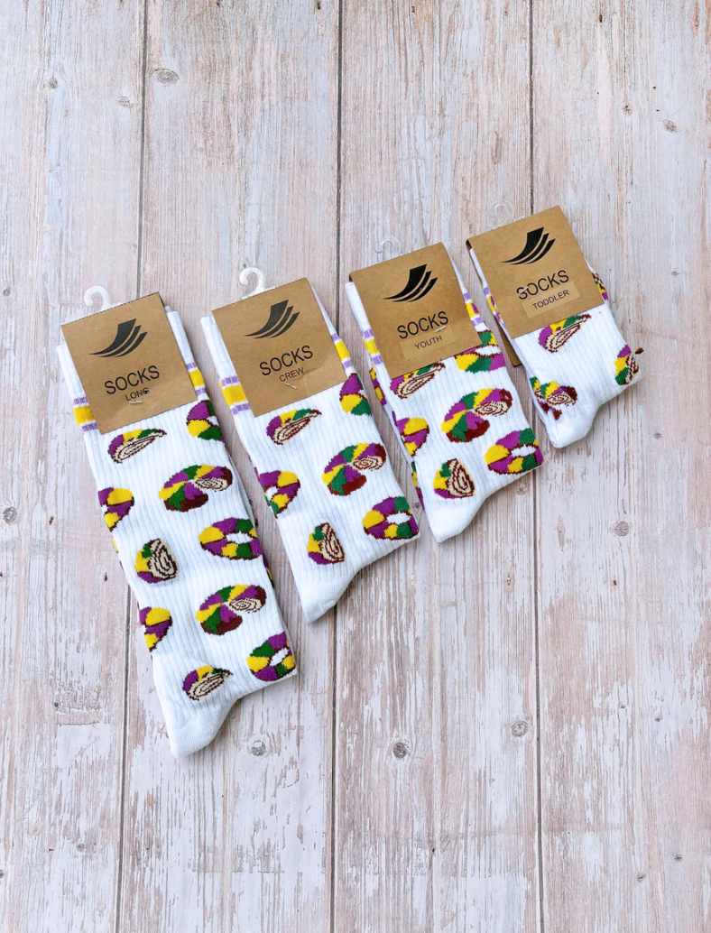 Unisex, Purple sock with green and yellow argyle print Cotton 75%, Poly 23%, Spandex 2% New Orleans & Louisiana inspired socks New Orleans Mardi Gras inspired socks perfect for Carnival season! Designed in NOLA We sell all of our products in our New Orleans retail Jeantherapy stores, with tried and true sell-through. Keep checking back for new items!
