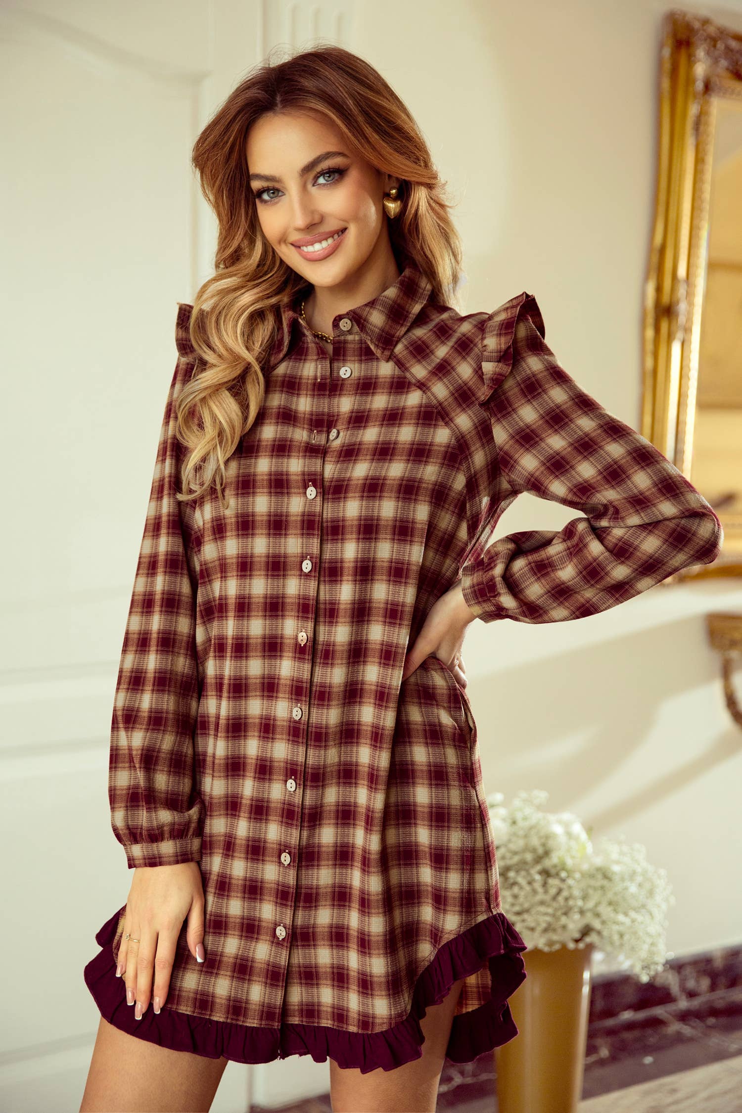 Classic plaid pattern gives this shirt dress a timeless and preppy look. Features a structured shirt collar and half button front for versatile styling. Ruffle hem adds a playful, feminine flair to this plaid mini dress. The long sleeve design is ideal for transitional and fall outfits. Brand labels are not included by default. If needed, please add them via this link ($0.50/pc): https://www.faire.com/product/p_mbyt838sy