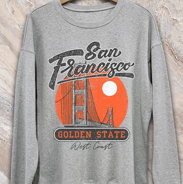 Show your Bay Area love in this royal blue crewneck, decked out with a bold gold graphic of the Golden Gate Bridge, basketball, and waves. The varsity-style "GOLDEN STATE" arch brings instant West Coast energy. Sporty, playful, and perfect for layering, this sweatshirt is city style with a twist. Fit Classic crewneck sweatshirt style. Fits true to size. Size up for a roomier fit. Fabric Soft and pillowy brushed fleece interior. Tightly knit, silky-smooth fabric face. Mid-weight, substantial but not heavy. 8.25 oz. 80% ringspun cotton, 10% polyester, 10% recycled polyester