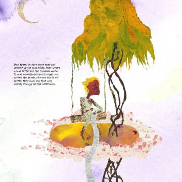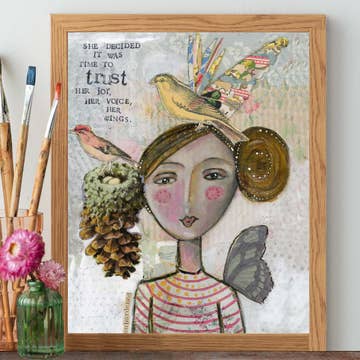 Reproduction of an original collage with handmade papers, photograph, Victorian wood engraving, and original verse. 8.5" x 11", unframed, with backing board and cello sleeve. Signed.