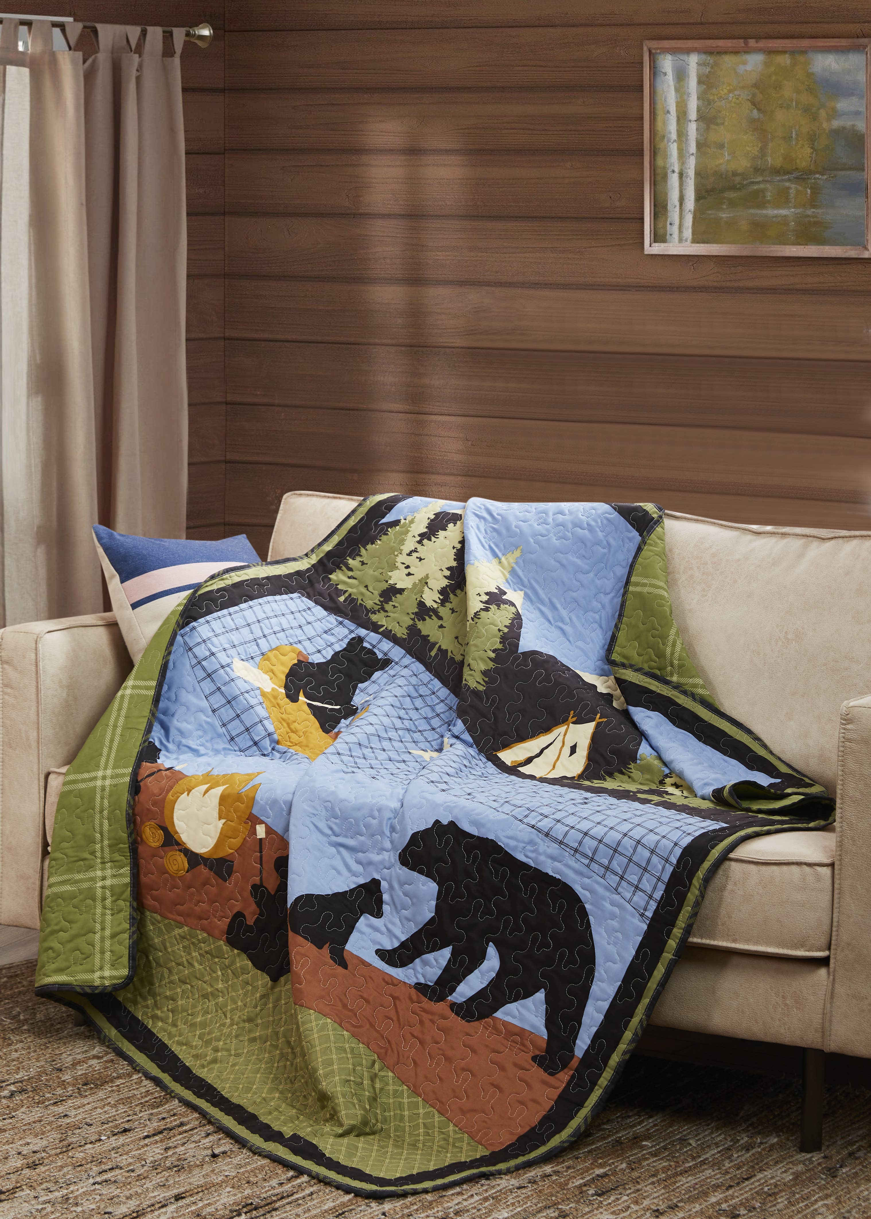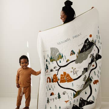 Cover up with this cozy, beautiful throw blanket. Featuring all 63 American National Parks posters and lined with super plush fleece. This throw blanket is perfect for the National Parks enthusiast in your life. Super thick, soft burgundy fleece backing. Size: 54" x 72" Washing Instructions: Machine Wash Cold/Tumble Dry Low Product designed and sewn by AdventureUs in Northern Wisconsin Materials: 100% cotton Riley Blake Designs™ Wilderness Wonders top, 100% polyester fleece backing Made in Wisconsin, USA of imported materials