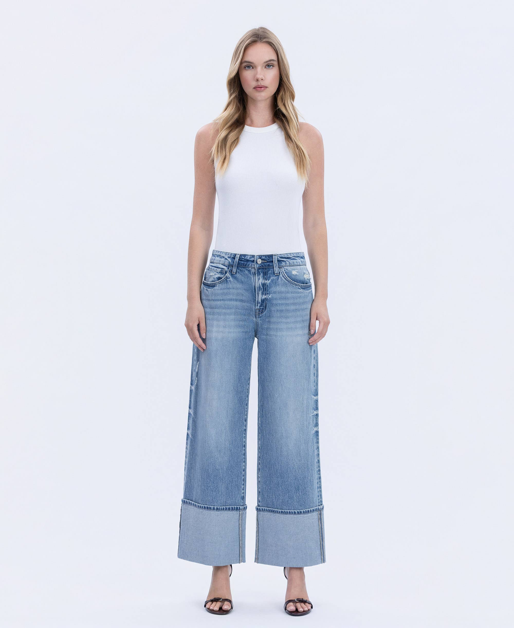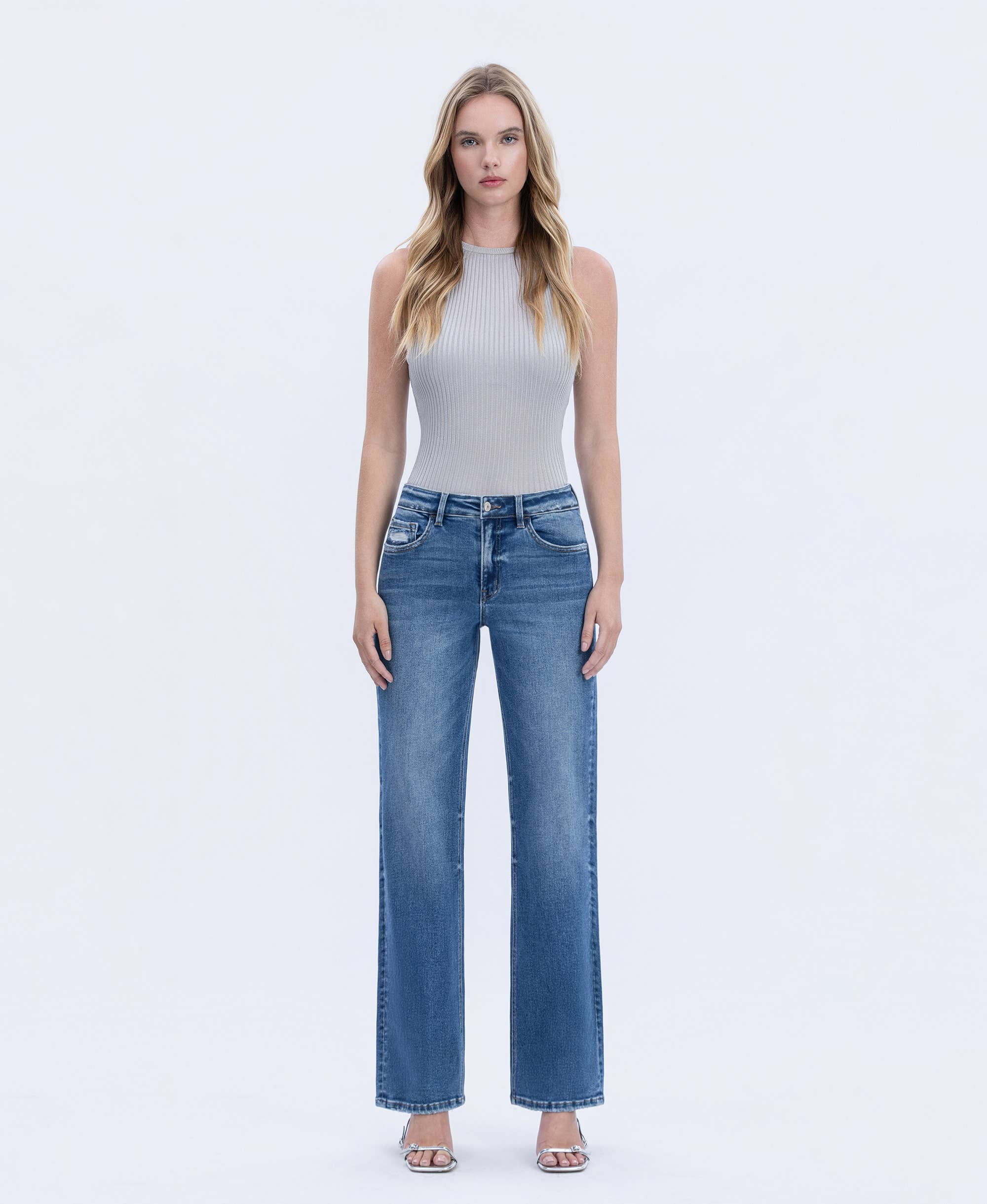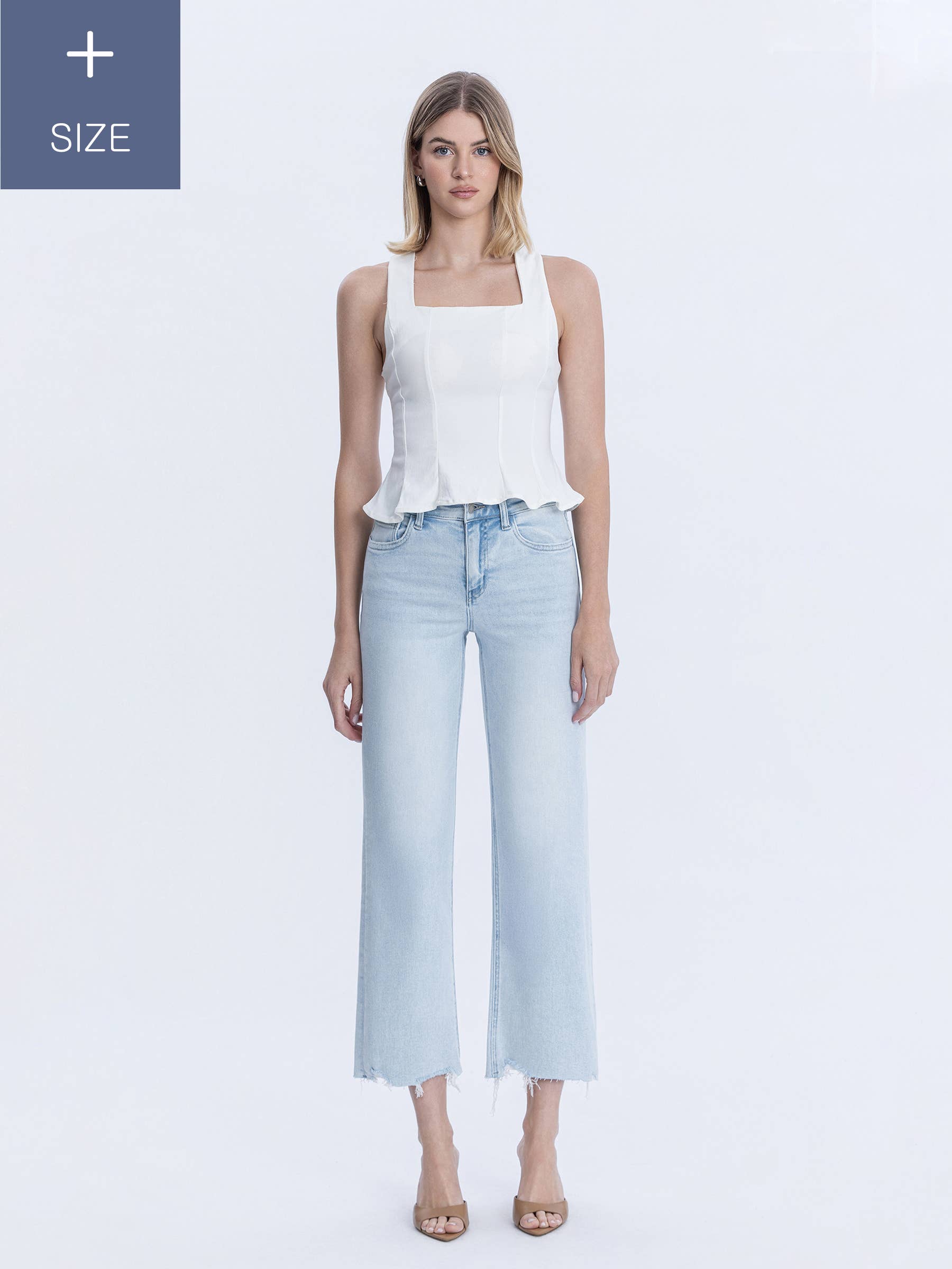 HIGH RISE LIGHT WASH SLIM WIDE JEANS COMFORT STRETCH DENIM, HIGH RISE WAIST, 5 POCKETS, RAW HEM, ANKLE LENGTH, LIGHT WASH, SLIM WIDE JEANS F. RISE: 10" / INSEAM: 28" / LEG OPENING: 18" MODEL IS 5'10" WEARING A SIZE 26