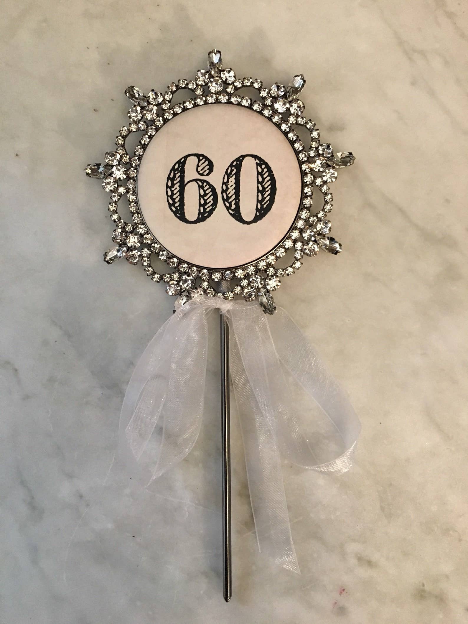 Made with rhinestones and a button center. Approximately 4 x 7" 7.5 x 4 inches made with rhinestones and button center. Cake topper or plant pick.