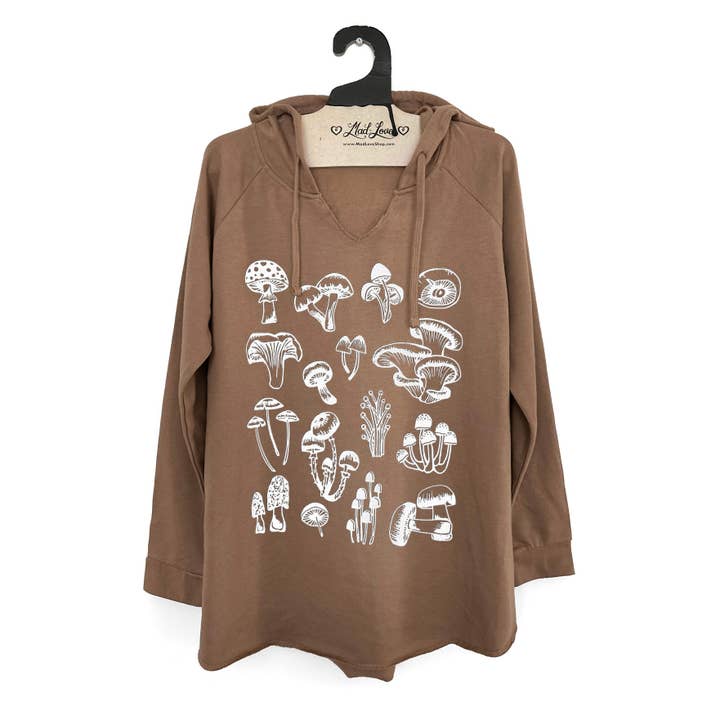 Other Options available please message me. Ladies Maroon Funnel Neck Lightweight Hoodie w/ Mushroom Fern Features: 5.6 oz., 55% cotton / 45% polyester, heathered jersey Funnel neck with hood and corded drawstring Front pouch pocket Relaxed silhouette