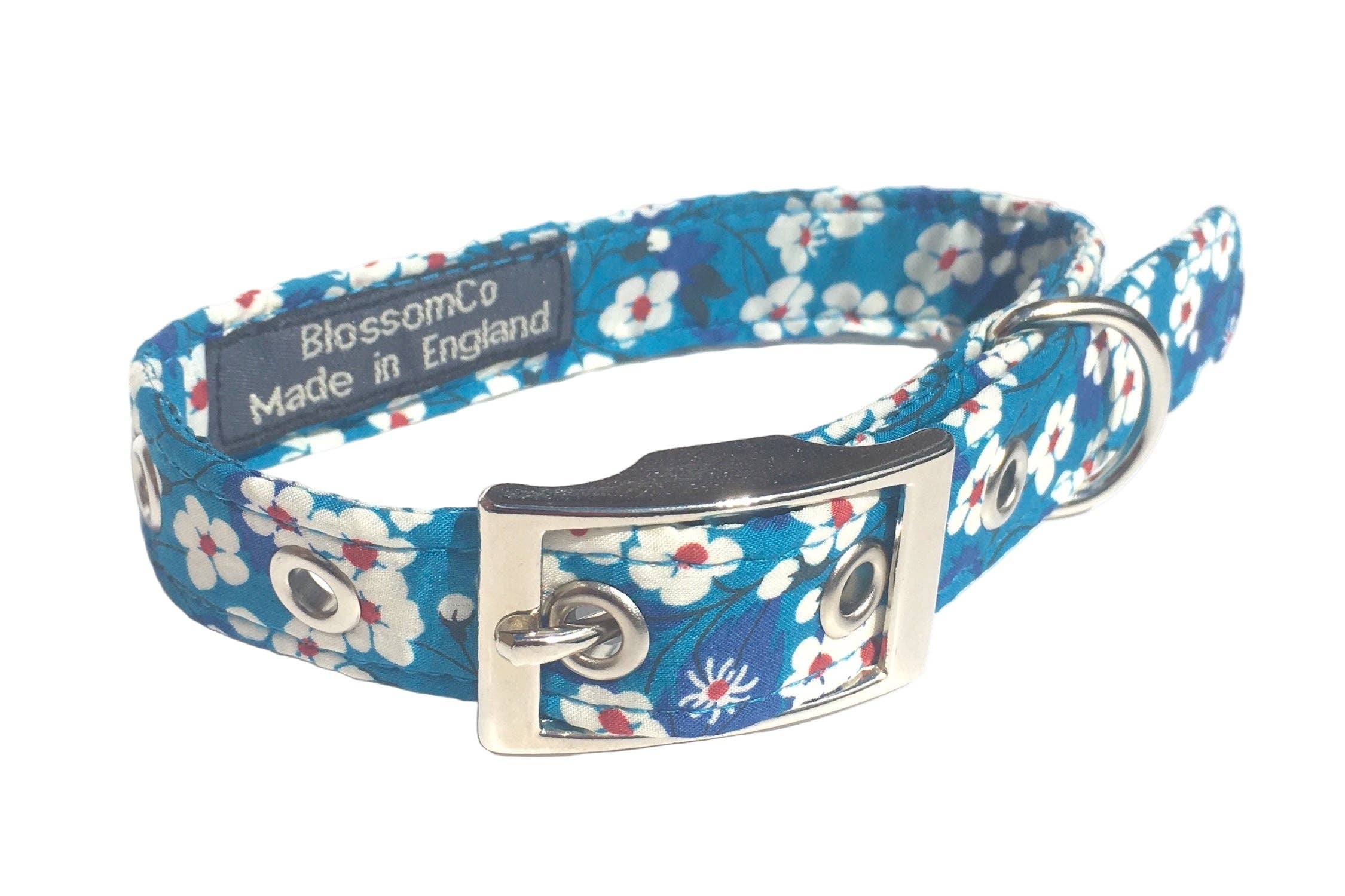 The colour of outdoor countryside pursuits, this gentle olive green and cream spot collar is the perfect pairing for walks over the fields to a pub for lunch or a woodland adventures through dappled sunlight. Crafted from cotton canvas, with a soft to touch cotton poplin floral lining, it is the epitome of comfort and style. Finished with metalware sourced from a British family run saddlery. * Elegant Olive Green cotton canvas front * Soft 100% cotton floral lining * Made in Britain * Handmade by our own sewing team * Available in small, medium and large sizes * Collar width 20mm (3/4 inch) for comfortable fit (S/M/L) * Also in Extra Small size for puppies and smaller dog necks * Collar width 16mm for Extra Small size * High quality metalware buckle and eyelets * Strong nylon inner core for maximum strength See the matching "Olive Twist" lead and dog bowtie here. From the BlossomCo Originals Collection