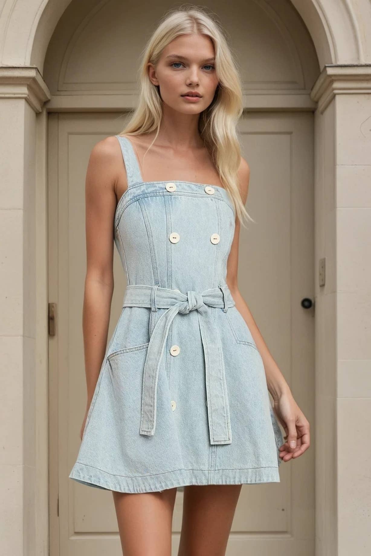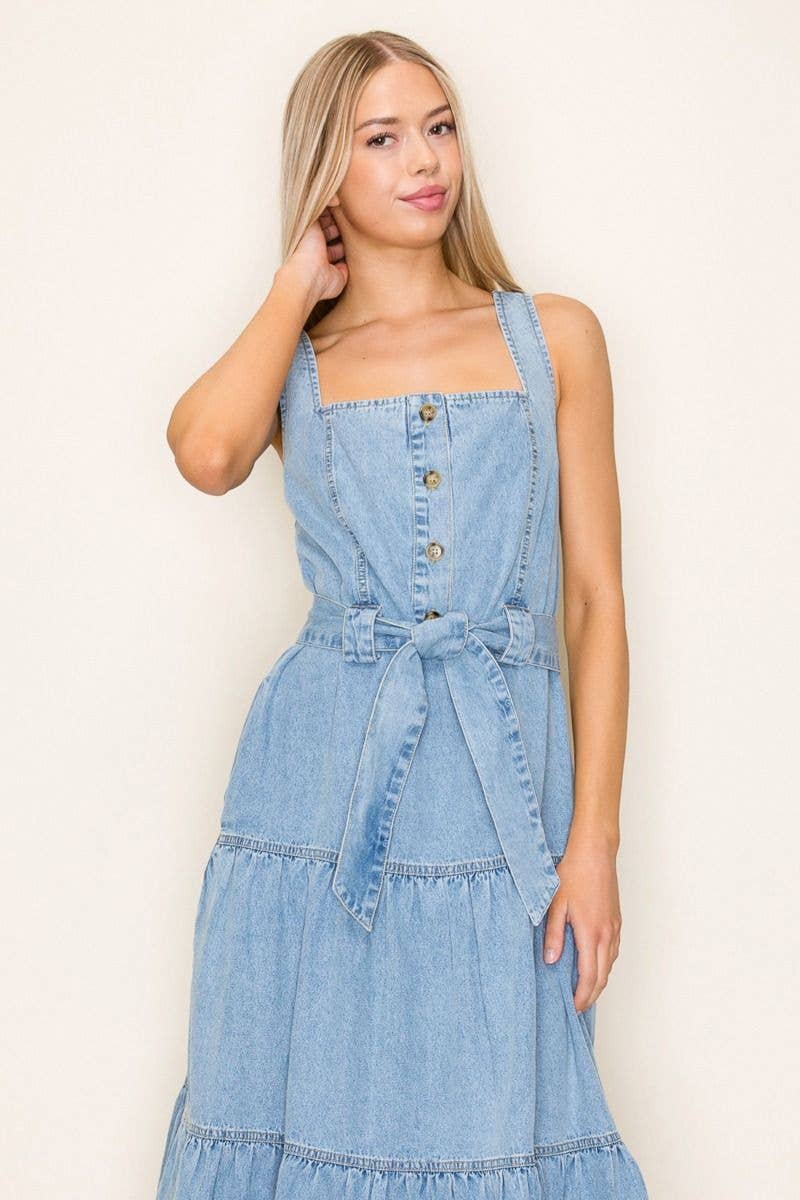-Washed denim dress -Deep v-neck with string tie -Pleated detail back -Sleeveless -Side pocket -Mini length -Imported Handwash Cold 100% Cotton Model is 5'7" and wearing a size Small.