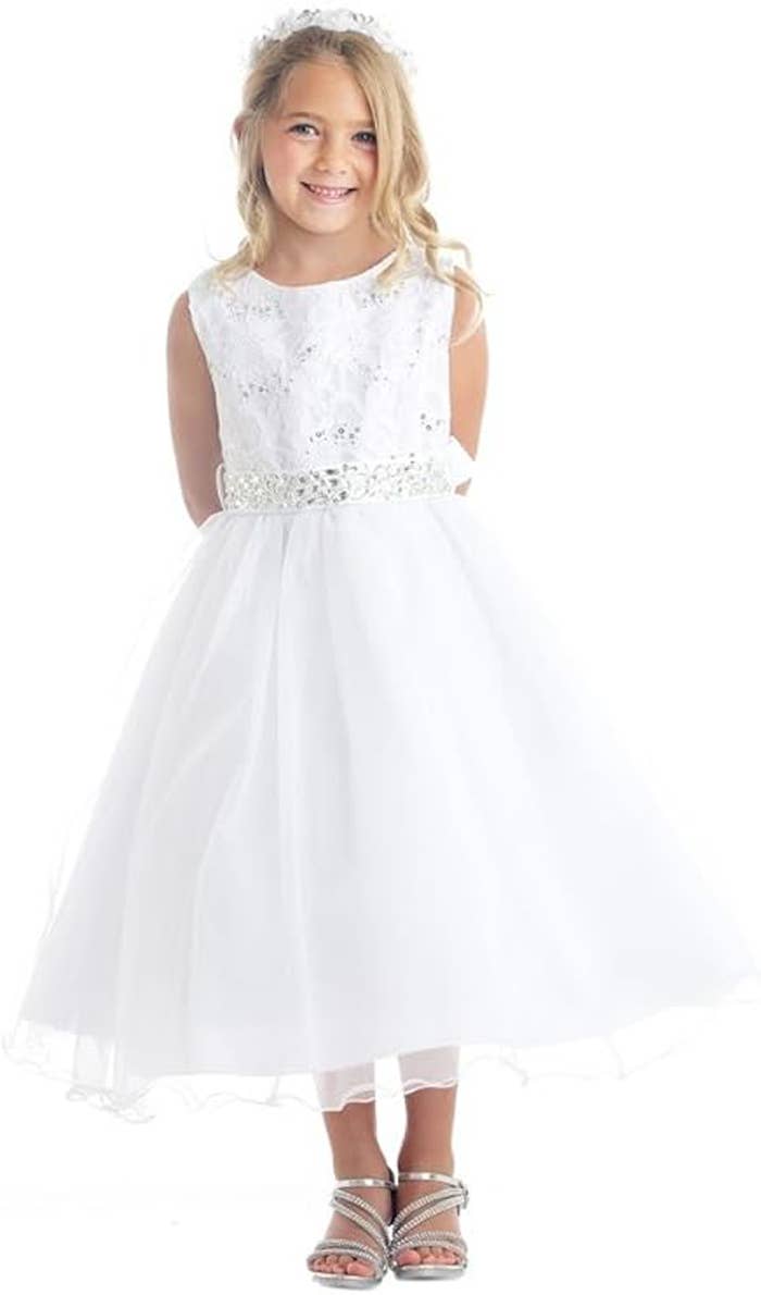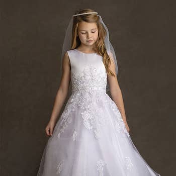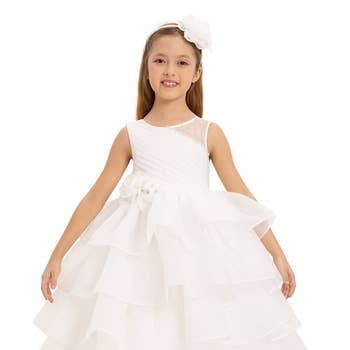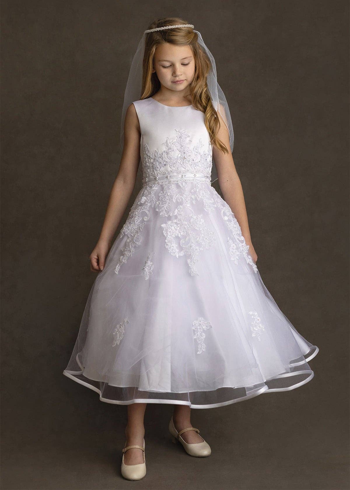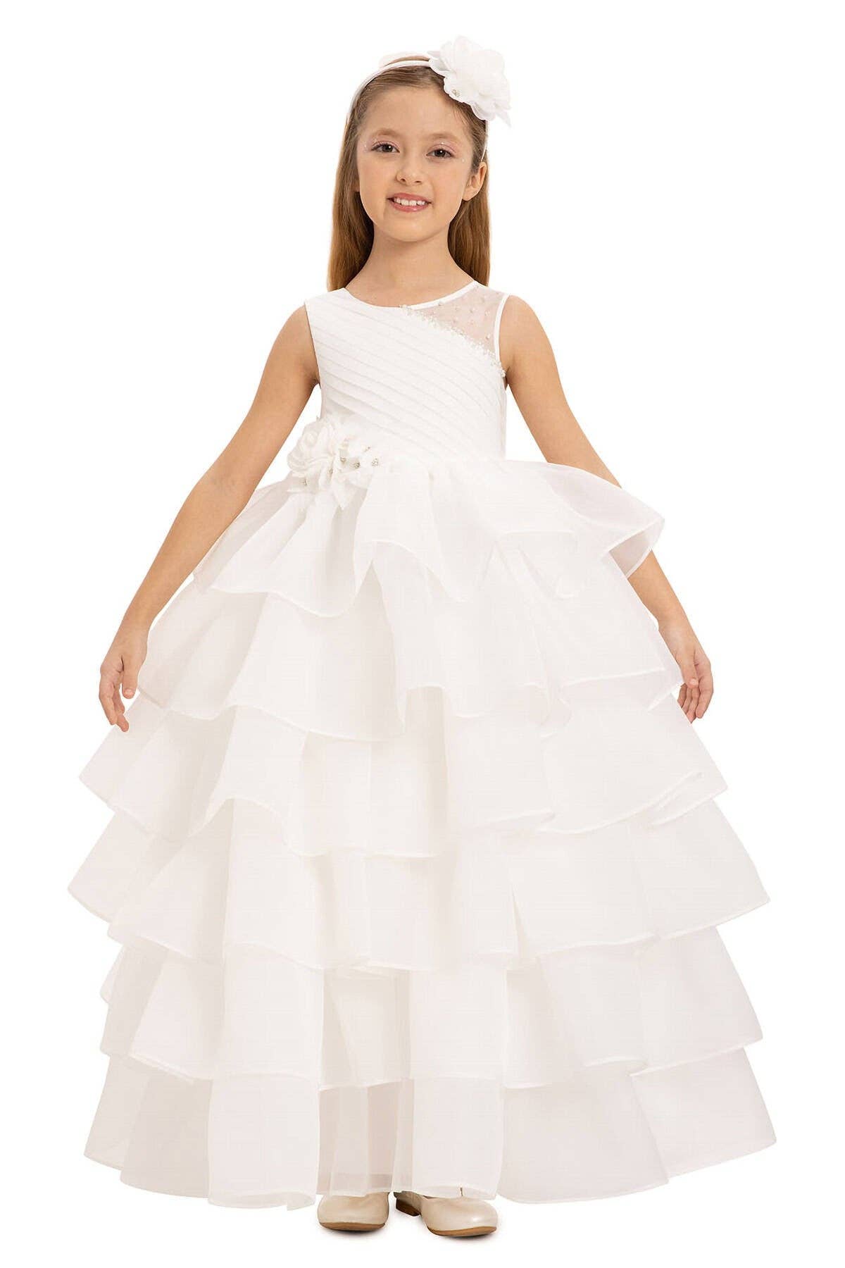**BLUSH SIZE 20 AND IVORY SIZES 2, 4, AND 6 ARE CURRENTLY UNAVAILABLE BUT WILL BE RESTOCKED BY OCTOBER 10, 2025. PLEASE KEEP THIS SHIP DATE IN MIND WHEN PLACING YOUR ORDERS. **THE ORIGINAL WAIST TRIM IS NO LONGER AVAILABLE IN THE WHITE COLOR. THE WHITE COLOR OPTION WILL NOW COME WITH THE LARGER FLORAL TRIM SHOWN IN THE CLOSE-UP PHOTO. This gorgeous princess-perfect multi-layered full-length tulle dress is detailed with a pearl floral applique on the neckline and a floral trim on the waist. Perfect for a grand entrance, this dress is layered with multiple solid tulle fabrics, creating a magnificent, luxurious dress.