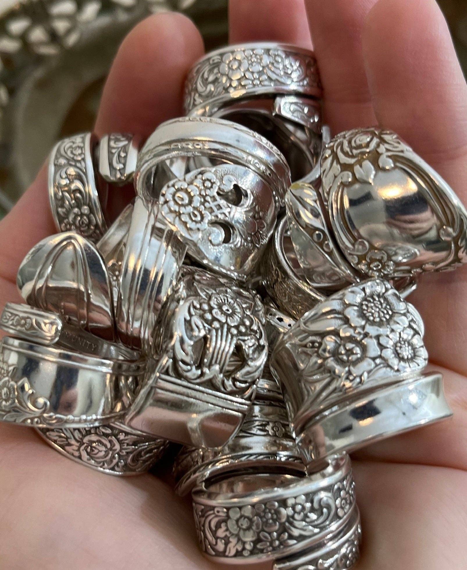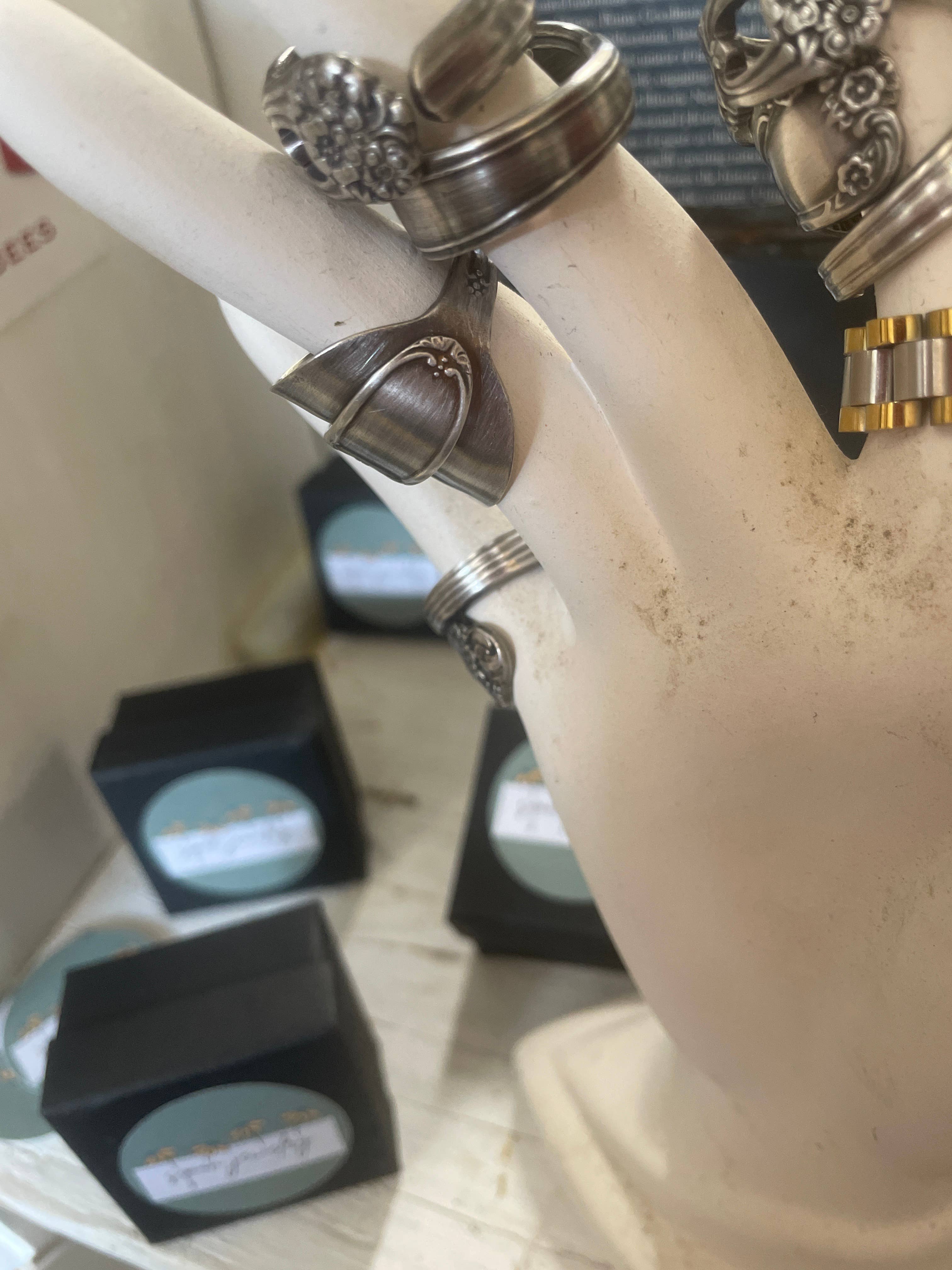 Our rings are made from vintage, recycled silver-plated silverware.🥄🥄 This style is made from the “QUEEN BESS” pattern which is very POPULAR BEAUTY!!🌸 See other listings for matching items or message to inquire about personalized options! 🫶🏻