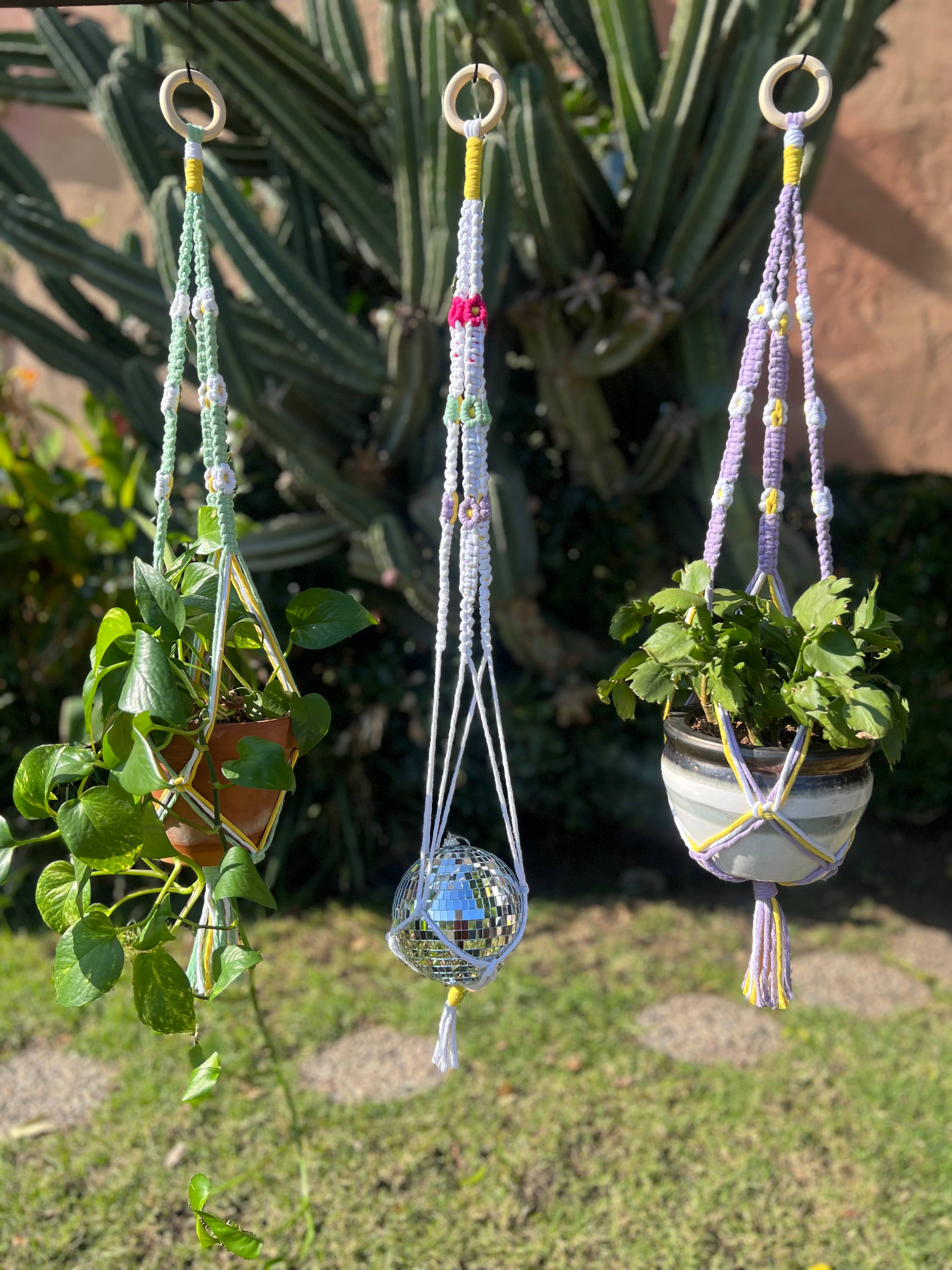 Catch the sun's rays and watch them dance around your plants and living room. Each hanger fits up to a 6" pot and comes with a 4” disco ball. Disco balls are attached to the hanger, no need for assembly. Custom colors available. Please reach out for full list of available options. Each plant hanger is made to order, and larger orders could create longer lead times. Please allow for slight color variations, as each batch of rope can be different.