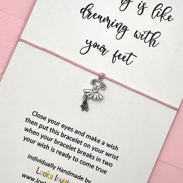 Dancing Wish Bracelet - Dancing is like dreaming with your feet This charming handmade bracelet with a cute dance leotard charm makes an affordable and thoughtful gift. The bracelet is made using a Tibetan Silver Charm on 1mm waxed cotton cord. You can choose a self tie option or an ADJUSTABLE sliding knot, making it suitable for a wrist or anklet. Many colour options are available to suit your customer preferences. The bracelet comes on a keepsake card with a matching envelope, which is embossed on the flap for an extra finishing touch, all packed in a bio-degradable clear bag. These cards measure 14.8cms x 10.5cms (approx. 6" x 4") and are printed on smooth thick white card. Tags: dancer gifts, ballet lovers, dance schools, teachers, students, dance recital gifts