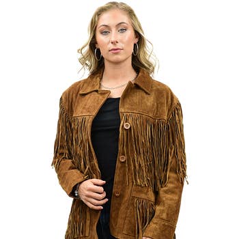 SUEDE FRINGE STUD JACKET -CROP FIT -OPEN FRONT -STUDS AROUND COLLAR AND BOTTOM -SUEDE MODEL IS 5'8" AND SHE IS WEARING OUR SIZE SMALL. IMPORTED WESTERN / SUEDE / FRINGE / RODEO / COWGIRL / FALL / WESTERN FASHION / FRINGE JACKET / DATE NIGHT / NIGHT OUT / STATEMENT PIECE / TRENDY /