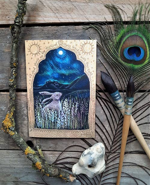 Two Hares sitting by a Woodland Spring This card is being sent direct from our little workshop in Cornwall Blank greetings card Card Size 7 by 5 inches/125 by 175mm Supplied with an envelope Fully recyclable and biodegradable We hope you like this card as much as we liked creating it.