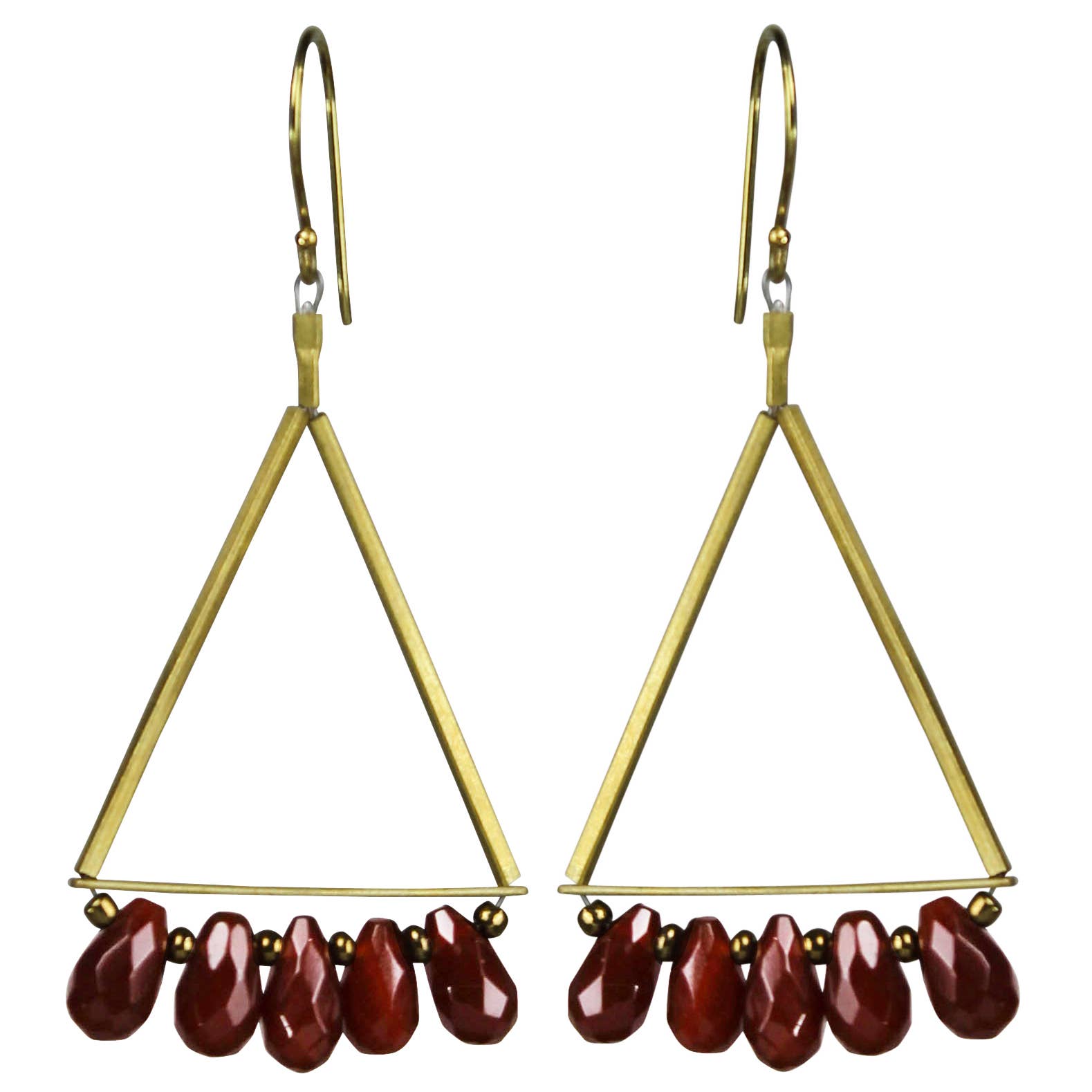 Gold plated brass hooks with tiny faceted carnelian beads and brass drops. Each earring weighs .09 oz. and measures 3.125 inches long. - case of 2 All pieces are made to order and handcrafted at our studio in New Jersey by skilled artisans who share our passion for quality and originality. Each piece is unique so stones and glass may vary in shape, size, and color. Stone inclusions may be visible to the eye and are considered a part of their beauty. Please allow 2-5 weeks for production. Our jewelry consists of plated metal, which may darken or tarnish over time with normal wear. Gently wipe the metal surface with a soft cloth to clean, however, excessive polishing may rub off or scratch the plating. Avoid direct contact with lotions, perfumes, or oils. Excessive light, heat, or moisture will deteriorate the quality of glass, plating, and stones. Do not wear jewelry while in a pool, hot tub, or bathing. If treated with care, your jewelry will last for years to come.