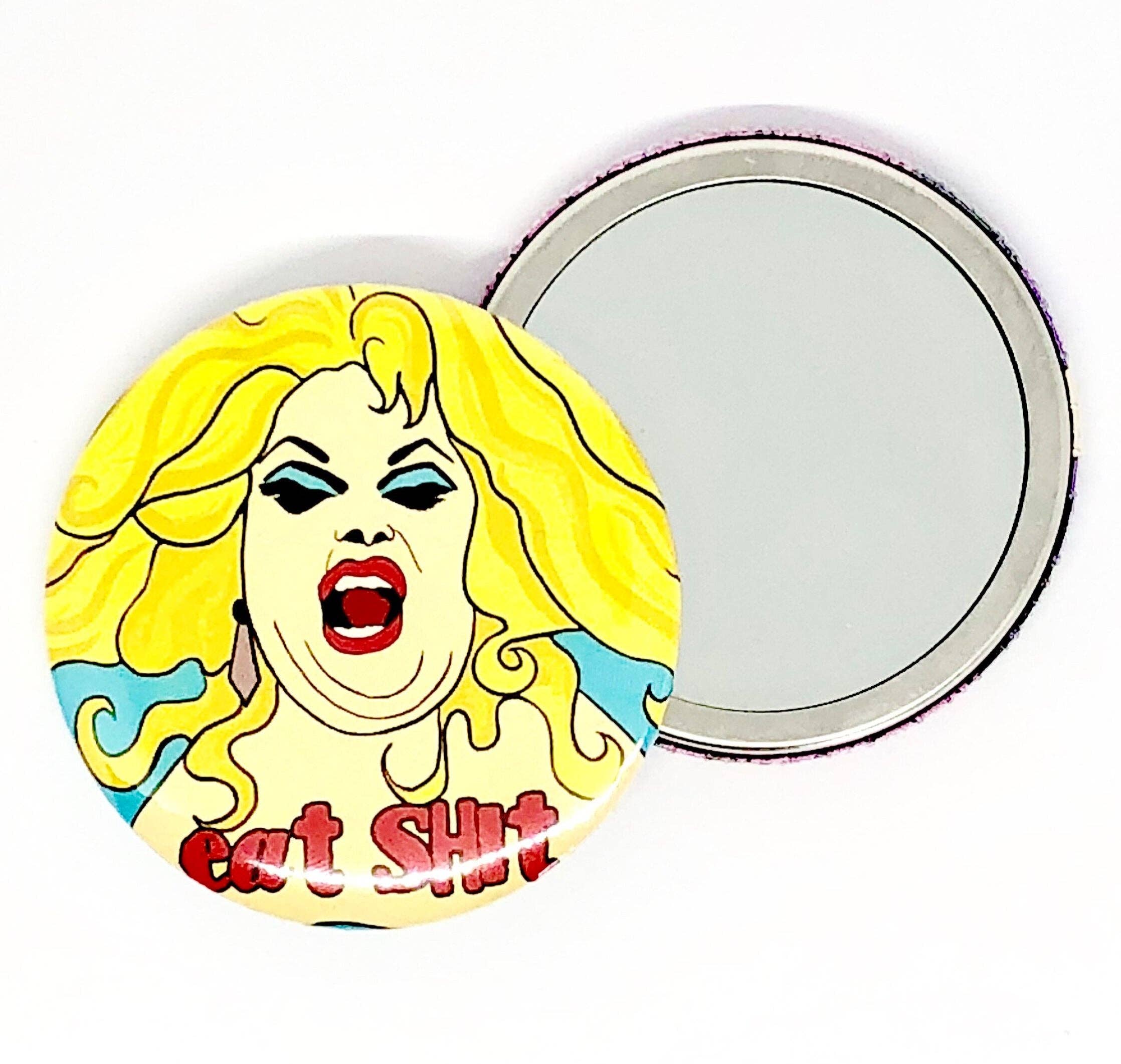 Design on the front with mirror on the reverse. Presented on a Bite Your Granny backing card with cello wrap. Measurements 58 mm (5.8 cm) Diameter This is not a hinged/folding compact.