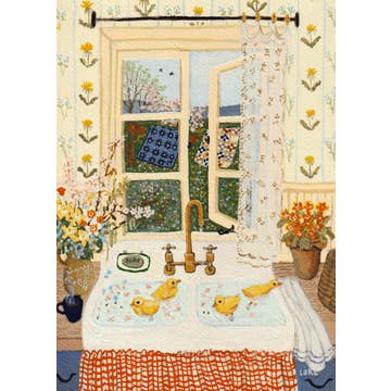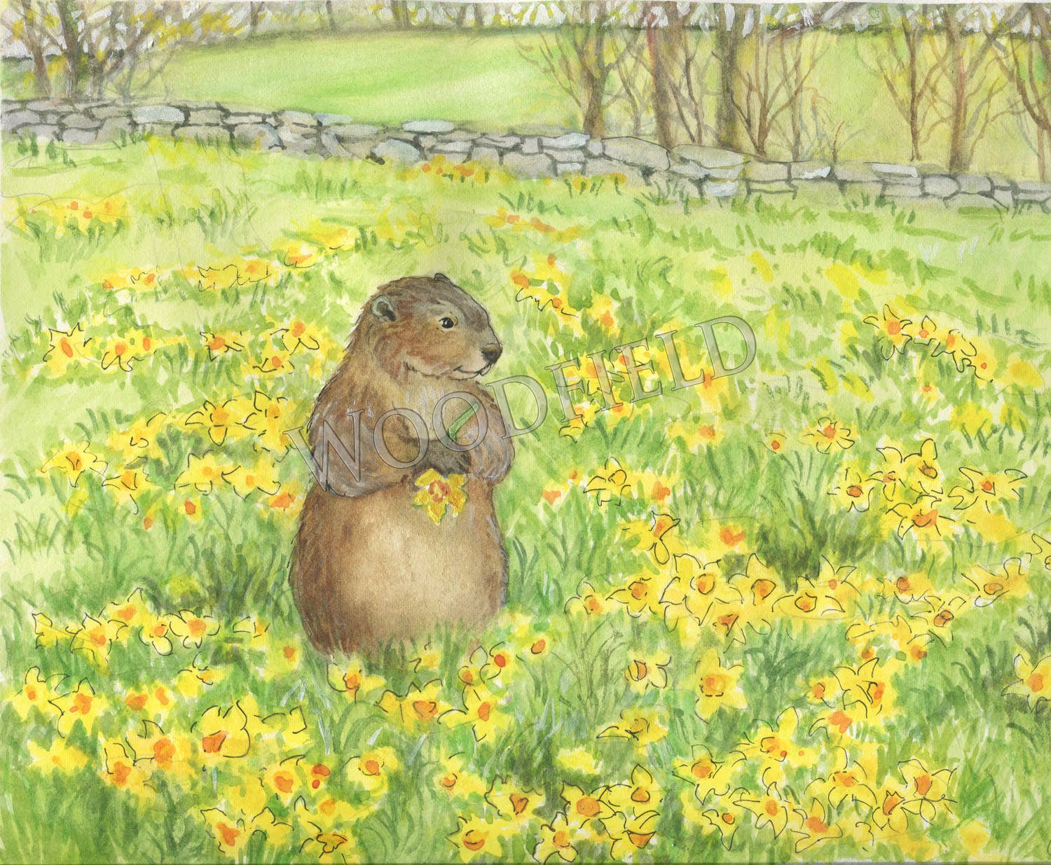 Individual 5-1/8" x 7" notecard comes with a white envelope. Front of card has image with a white border. The inside is blank. A short storyline is written on the back of the card. "Behind the orchard there was a field that bloomed with yellow daffodils in the spring. It was Walter's favorite thinking spot." Also Available as a Matted Print, ready for framing - See our Print Section