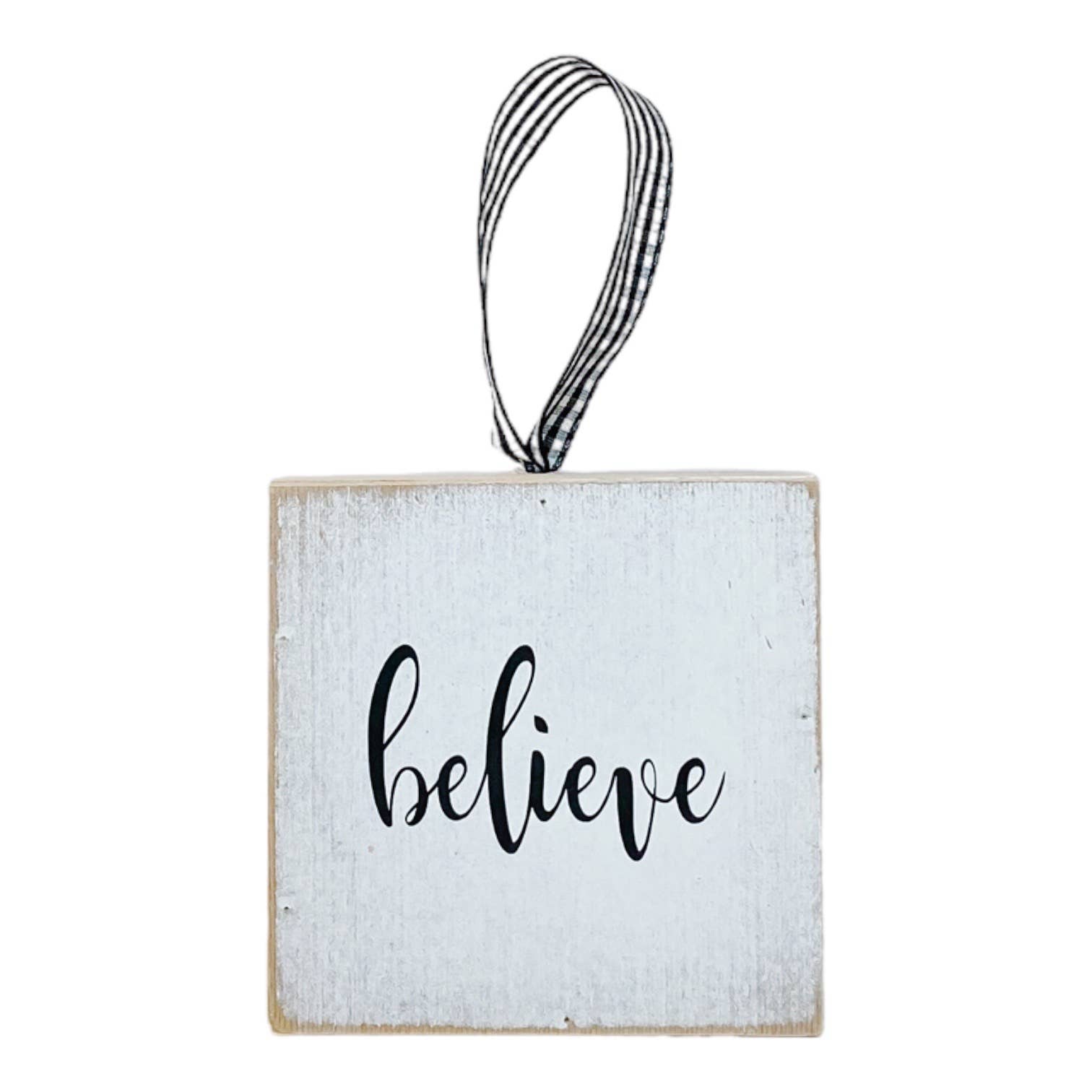SET OF SIX white wood distressed farmhouse block hanging Christmas ornaments. Each set contains one of each of the following ornaments- Jesus is the reason Jesus loves me Silent Night It is well with my soul Hope is born Merry Christmas Each ornament measures 3.75" x 1.625" x 3.75". Includes black and white checked ribbon to hang from your Christmas tree.