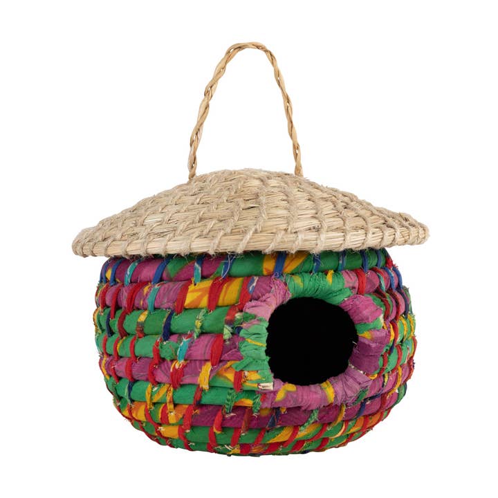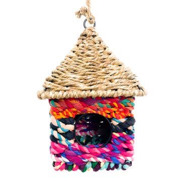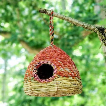 A bright eco-friendly birdhouse, handcrafted from wire and recycled snack wrappers. These pre-consumer factory leftovers would otherwise be discarded. Metal frame, recycled plastic - Not recommended for outdoor winter use - Opening for bird measures 6cm in diameter. Birdhouse measures 7 inches in diameter at widest point x 9 inches high (not including hanger). Hanger measures 12 inches long (when folded in half). - Made in India - Noah's Ark International Exports is a fair trade handicraft marketing organization in Moradabad, India. Noah's Ark provides benefits such as education and medical treatment for artisans and their families. As artisan businesses become more self-sufficient, Noah's Ark takes on new families. Since the company's inception, about 20 artisan workshops have become independent.