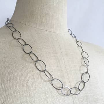 A Shepherd's Run fan-favorite and one I've been making since the beginning, in various iterations. The current version is my favorite weight of chain- not too heavy, not too light. The perfect length for many necklines. It runs about 26" and can be adjusted to wear at different lengths depending on where you want it to fall as the hook can clasp into any link! Each argentium silver link is approximately 1" long and about 1/4" wide- and every link is hand fused, shaped and hammered so you will see variations within the chain, proudly showing it's handmade character.