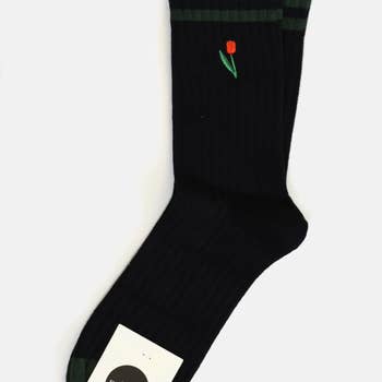 These ultra-soft crew-length socks feature a tattoo-inspired flower design. Responsibly manufactured in a sweatshop-free factory. Original Tinta design. Content and Care * 70% Cotton, 20% Spandex, 10% Elastic * Machine wash cold * Tumble dry on low * Do not bleach Sizing and Fit One size fits most. Ideal for US men's shoe sizes 6-12.
