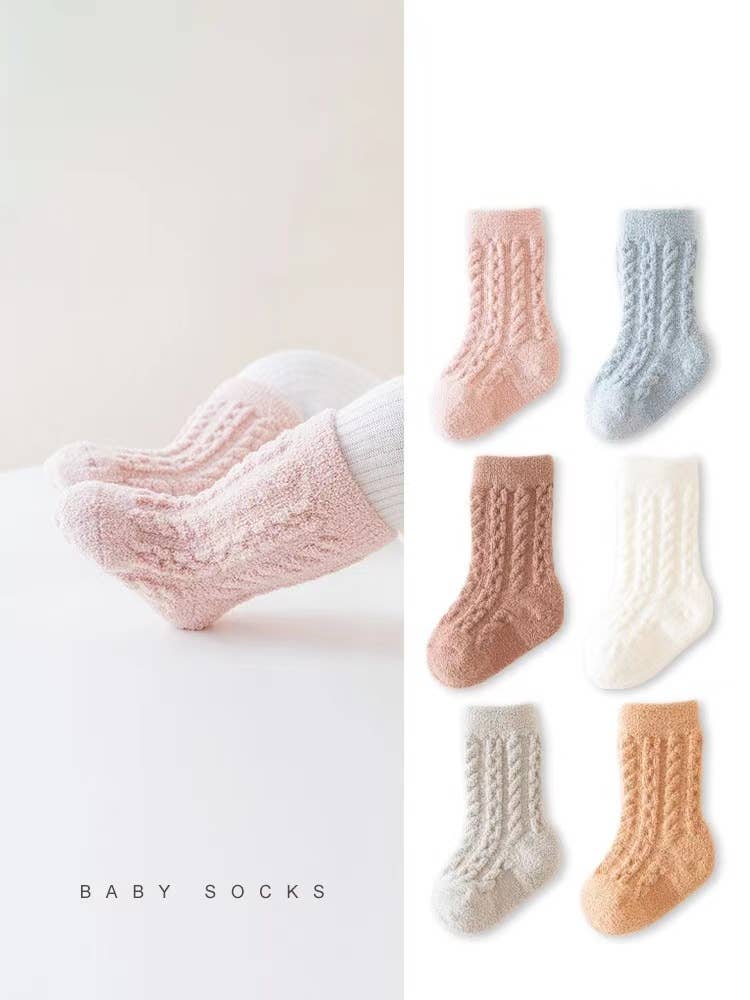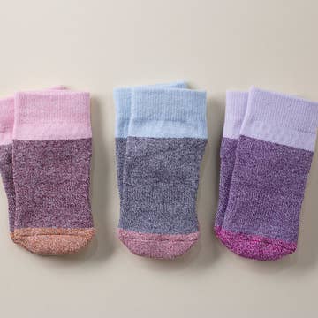 Our Baby Socks come in sets of 3: a pair + a spare! Colors in this sock: pink, white, light purple, light pink.