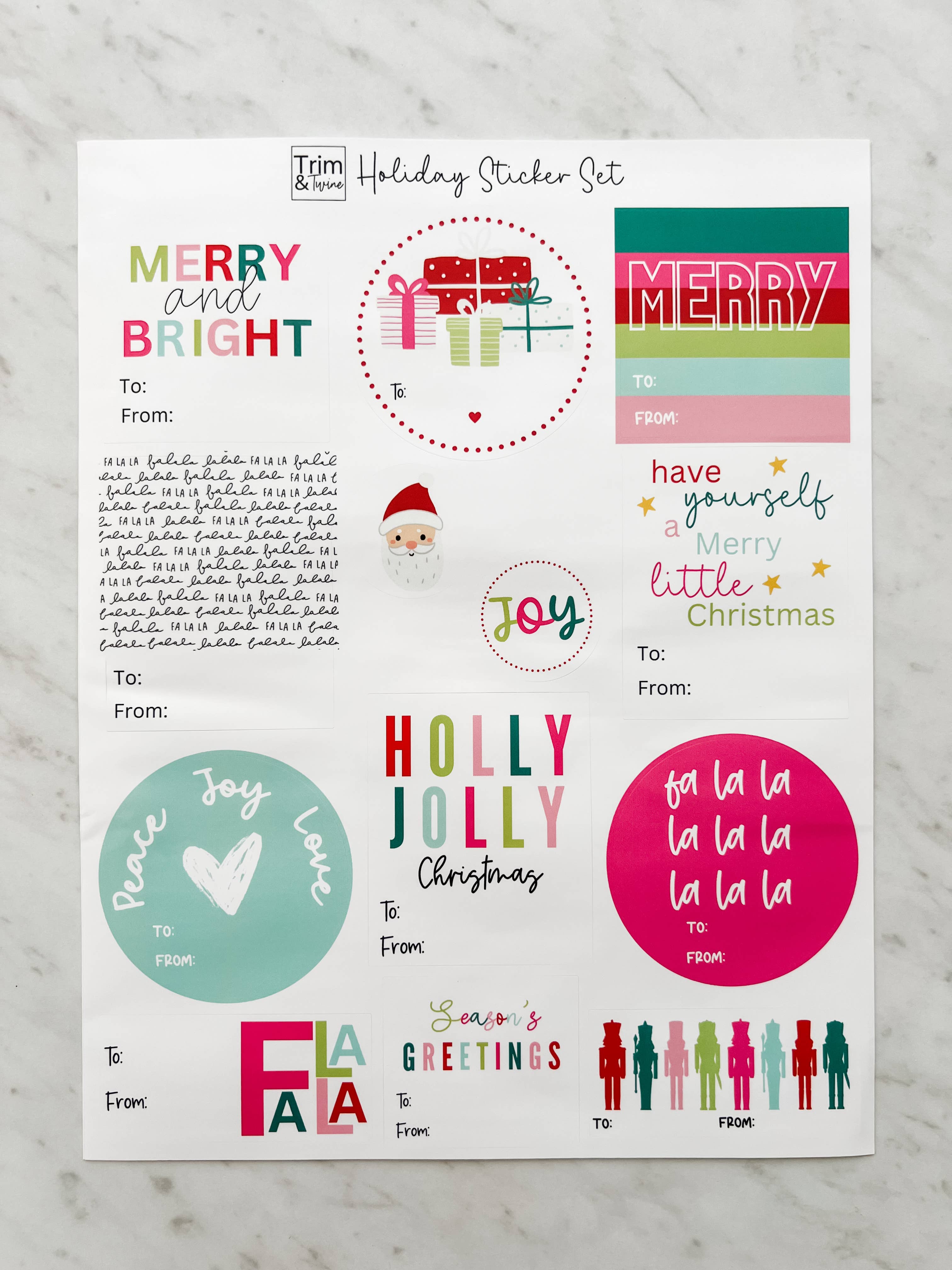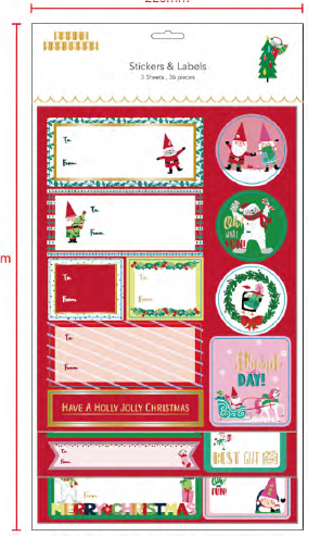 **Holiday orders can begin shipping August 15. Orders placed with earlier ship dates will be split unless otherwise requested.** For the love of snail mail - a holiday sticker sheet featuring 4 gift labels and 12 additional parcel decorating additions. • 5 x 7" finished size • Waterproof, matte vinyl stickers • Cello sleeve packaging • Made in the USA