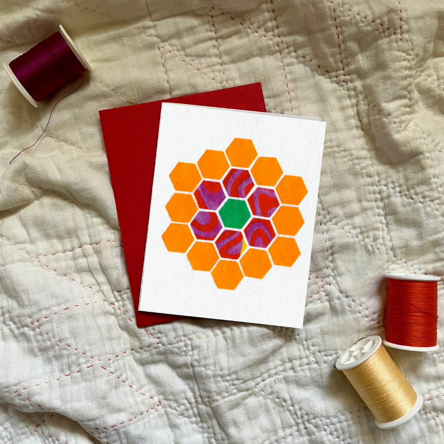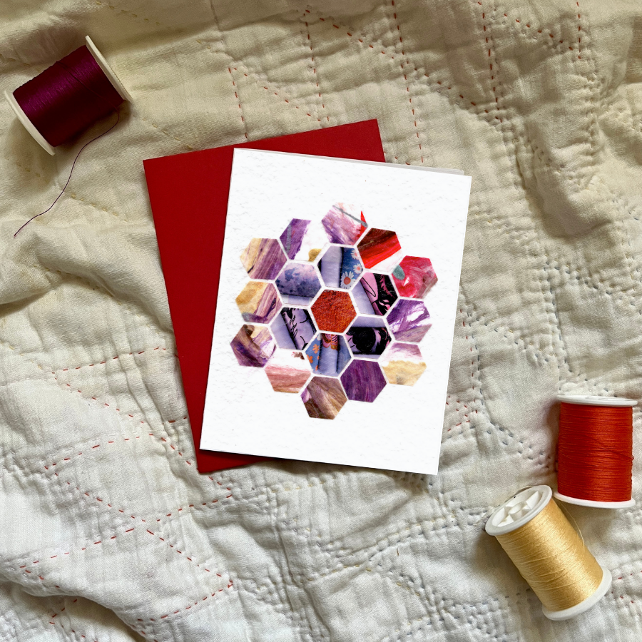 Unique, Colorful Quilt Pattern Greeting Card Quilts and quilt patterns have long been used to communicate, often when words could not. These cards celebrate and honor their powerful symbolism and my quilting heritage. Each one is printed from a unique and handcrafted collage, made with love from recycled paper, magazines and scraps. In my work and my life I am constantly reminded that when we put our hands to tasks, our hearts can shine. Product Details: A2 (4.25 in. x 5.5 in.) Greeting Card printed on linen textured card stock Quilt Pattern featured on front: North Star Blank inside Includes coordinating envelope (colors may vary)
