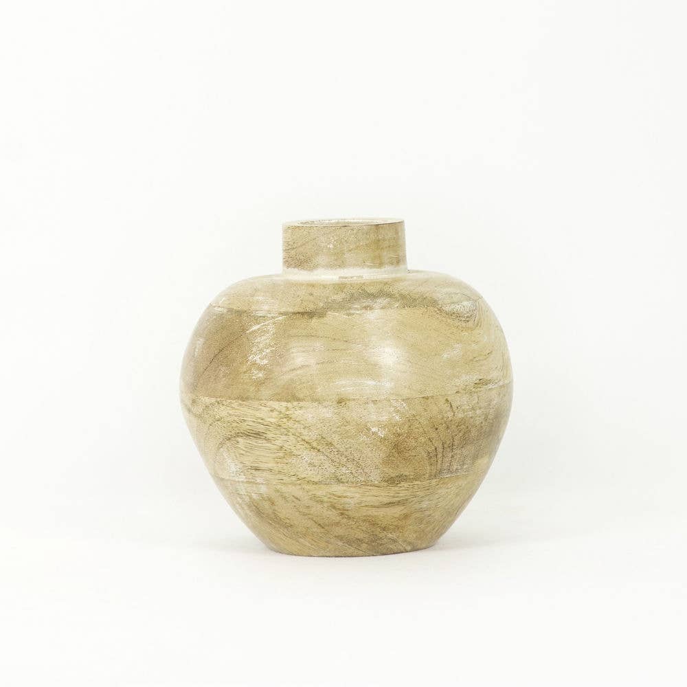 Our newest wood collection features hand carved vases made from Paulownia wood that is very light in color and perfectly matches a lighter Californian design theme. Our large vase is gorgeous as a statement center piece, with or without your favorite dried florals displayed. Please note that this vase is for decorative use only, and cannot hold water. Dried flowers can be placed in the vase for display. The vase has enough space to fit stems in the neck of the vase, but please note that the vase is not hollow. Only the neck has open room. Please also note that each item is handmade and has natural idiosyncrasies like cracks and bumps in the wood. - Sold without flowers. - 7" diameter x 12" height - Hand carved Paulownia wood - Light natural color - Please note each piece of wood is natural and may have minor dents, cracks, and spots - Imported