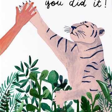 A card of congratulations and encouragement. This kitty gets a nice little head pat for a job well done. Risograph printed in sunflower yellow and violet. - A2 folded card, blank inside - Contrast envelope - Eco-friendly, vegetable-based ink - Printed on 100% recycled, FSC-certified fiber-fleck cardstock - Commercially compostable sleeve
