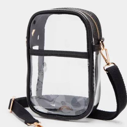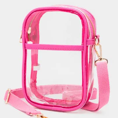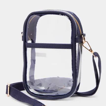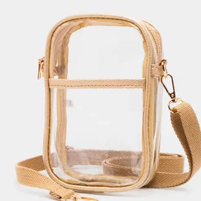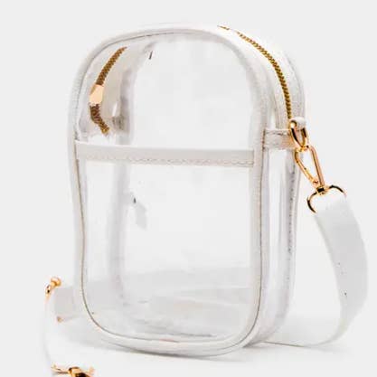 • Size : 6" X 7.5" X 3" • Strap : Adjustable, Detachable • Zipper Closure • One Outside Slip Pocket / Magnet Closure • Compact and stylish clear crossbody bag featuring a secure zipper top, wide adjustable strap, and sleek gold-tone hardware. Perfect for stadium events, concerts, or travel, offering convenience and compliance without compromising on modern style.