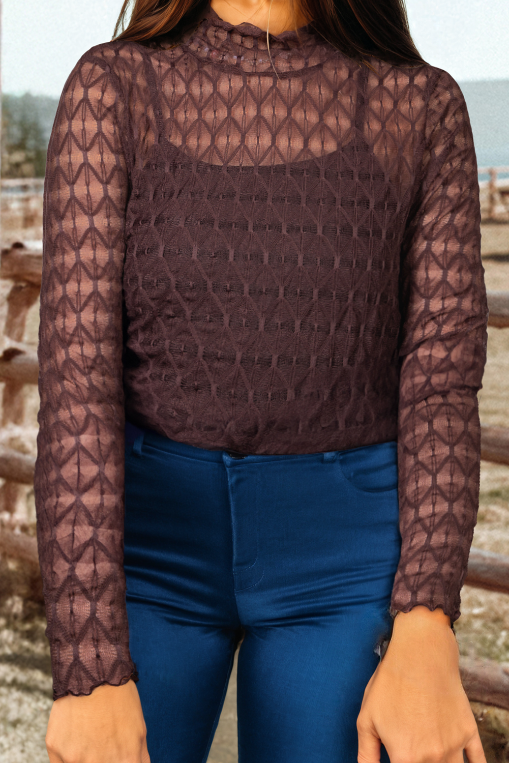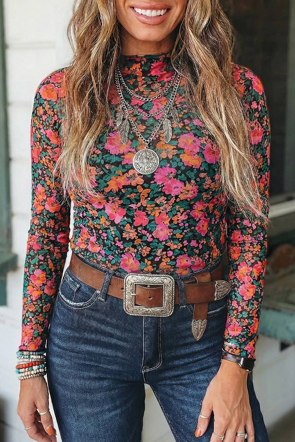 Fashion-W Floral Long Sleeve Mock Neck Sheath Mesh Blouse