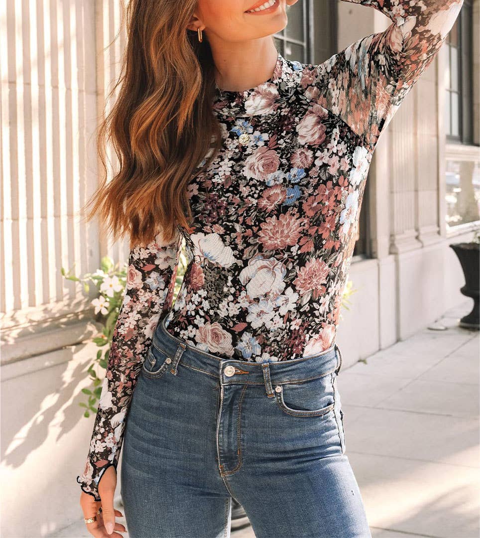 Wholesale Fashion-W Floral Long Sleeve Mock Neck Sheath Mesh Blouse
