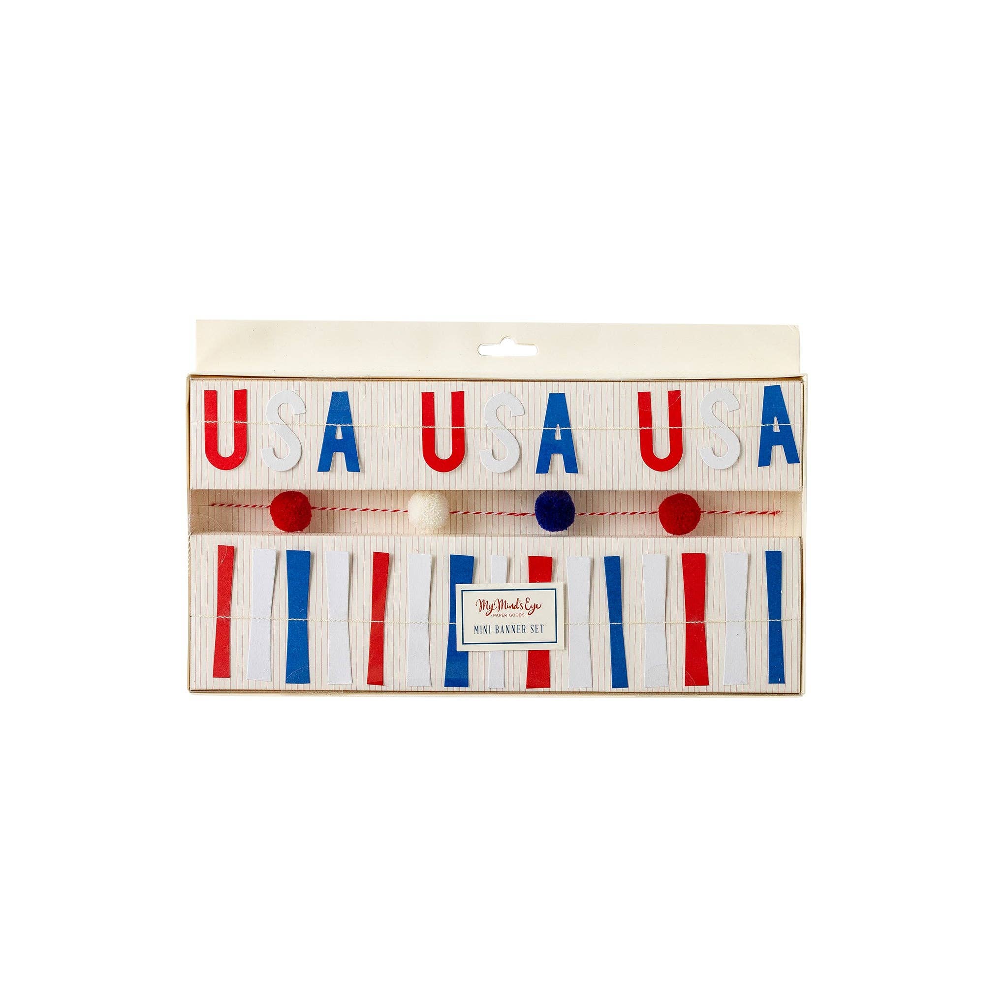 Celebrate the USA in red, white and blue with this festive banner set! This banner set includes red, white and blue pom pom banner, a mini USA banner, and a patriotic ticker tape banner. This banner set makes quick and stylish work of decorating a backyard barbeque or mantle display! • USA banner approximately 5 feet long pre-stitched • Pom pom banner approximately 5 feet long pre-strung • Ticker tape banner approximately 5 feet long pre-stitched • USA letters 1.5 inches tall 3 Sets Makes One Wholesale Pack
