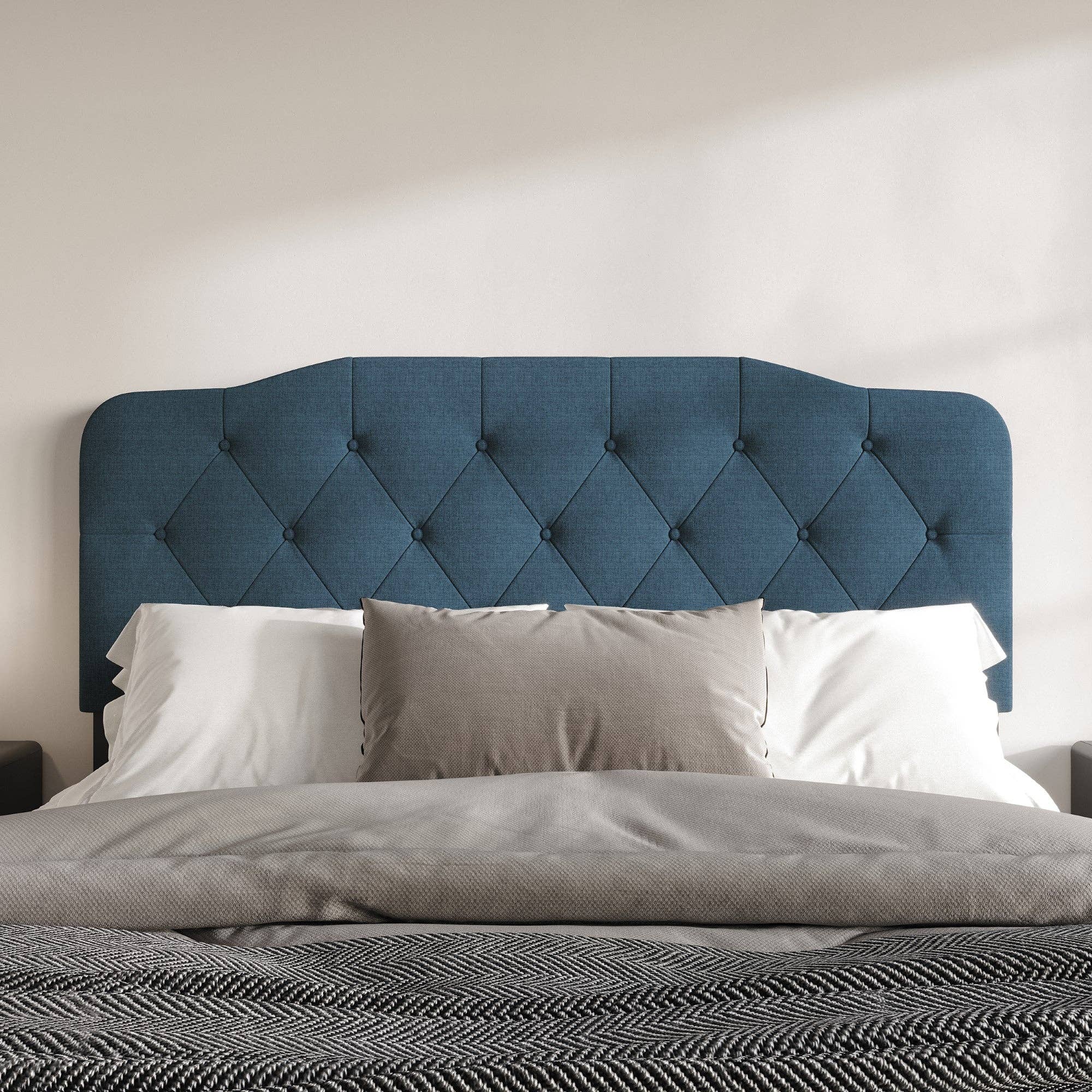 Claim the subtle elegance of vintage glamour with the Veronique Channel Tufted Scalloped Performance Velvet Upholstered King/California King Headboard. Dense foam padding and stain-resistant performance velvet upholstery create a luxurious surface of repose when reclining, reading, or conversing in bed. The Veronique Headboard for king or Cali king beds has vertical channel tufting details that combine with a scalloped edge to present a timeless elegance that enhances your bedroom decor. The Veronique Upholstered Cali King / King Headboard has three height-adjustable mounting positions to customize your bedroom needs and solid post legs for support. Fits most king and California king beds Set Includes: One - Veronique King/California King Headboard. Channel Tufted Headboard Performance Velvet Upholstery Scalloped Edge Accents Height Adjustable Mounting Dense Foam Padding King/California King Headboard. Overall Product Dimensions: 3"L x 78.5"W x 30.5"H.