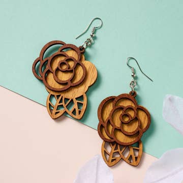 Thank you for shopping our ever-growing line of handmade accessories using laser and sublimation printing techniques. Please check back often as we expand our offerings here on Faire. ---Product Details--- ITEM: Handmade Laser Cut Walnut Scroll Earrings MATERIAL/FEATURES: 1/8" thick Laser Cut Walnut wood earrings with fish hook finding. SIZE: See photos for more details. CASE SIZE: 5 Pairs