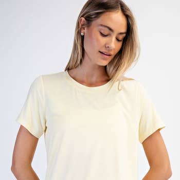 Anything but basic, this super soft and stretchy modal tee is an exceptional quality and fit. Your customers will love the longer length and scooped hemline. With a slight a-line shape, this top is flattering to wear on its own or layered. With pajama softness, you can even match it with cute pj bottoms and wear it to bed. -Fabric composition: 95% modal 5% spandex -Same cut as our favorite tee -V-neckline -Imported