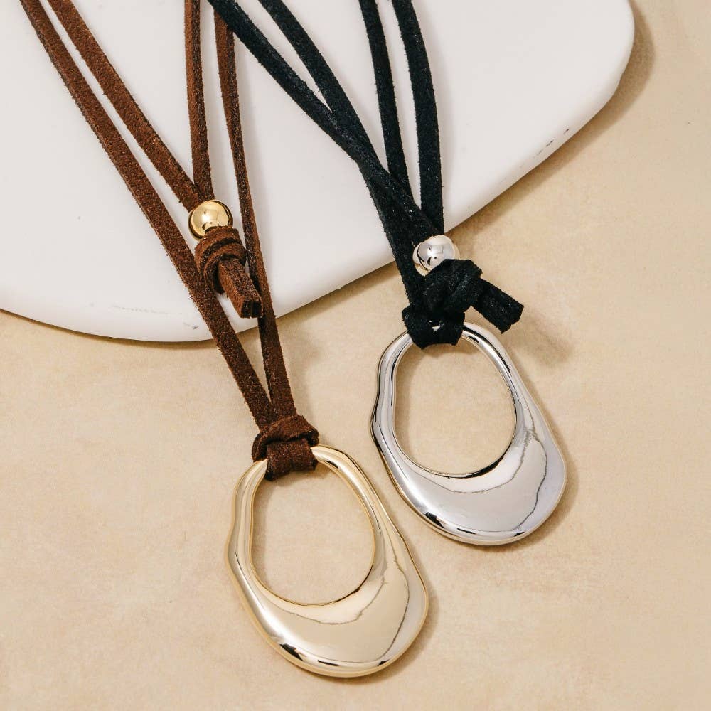 A bold and daring choice, perfect for those who want to stand out from the crowd, this necklace features a distinct hammered oval faux suede cord design. Elevate your everyday style with this versatile necklace, a simple yet impactful addition to your fashion repertoire. Available in G, S. This item is sold in packs of 1. This necklace is made with 50% Zinc and 50% Suede. Made in Korea.