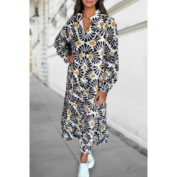 This pattern was inspired by the silhouettes of Indian palace doorways created during sunsets. This light black and white dress, was block printed using the DABU technique, which is a mud resist. The dress is ever so soft and feels so luxurious to touch. The buttons are made of coconut shells - making it a perfectly sustainable dress. Style it up with a belt or wear it as is for a a more relaxed look. - printed using carved wooden block - dyed in natural dyes - color: black - fabric: Modal - size: Length: 47" | fits sizes 0-20 (XS - 2XL) - 2 pockets! - buttons: made of coconut shells - Aya is 5' 2 CARE: Hand wash for the first few washes or Machine Wash on Gentle Cycle in cold water. Lay Flat to Dry. Iron if necessary.