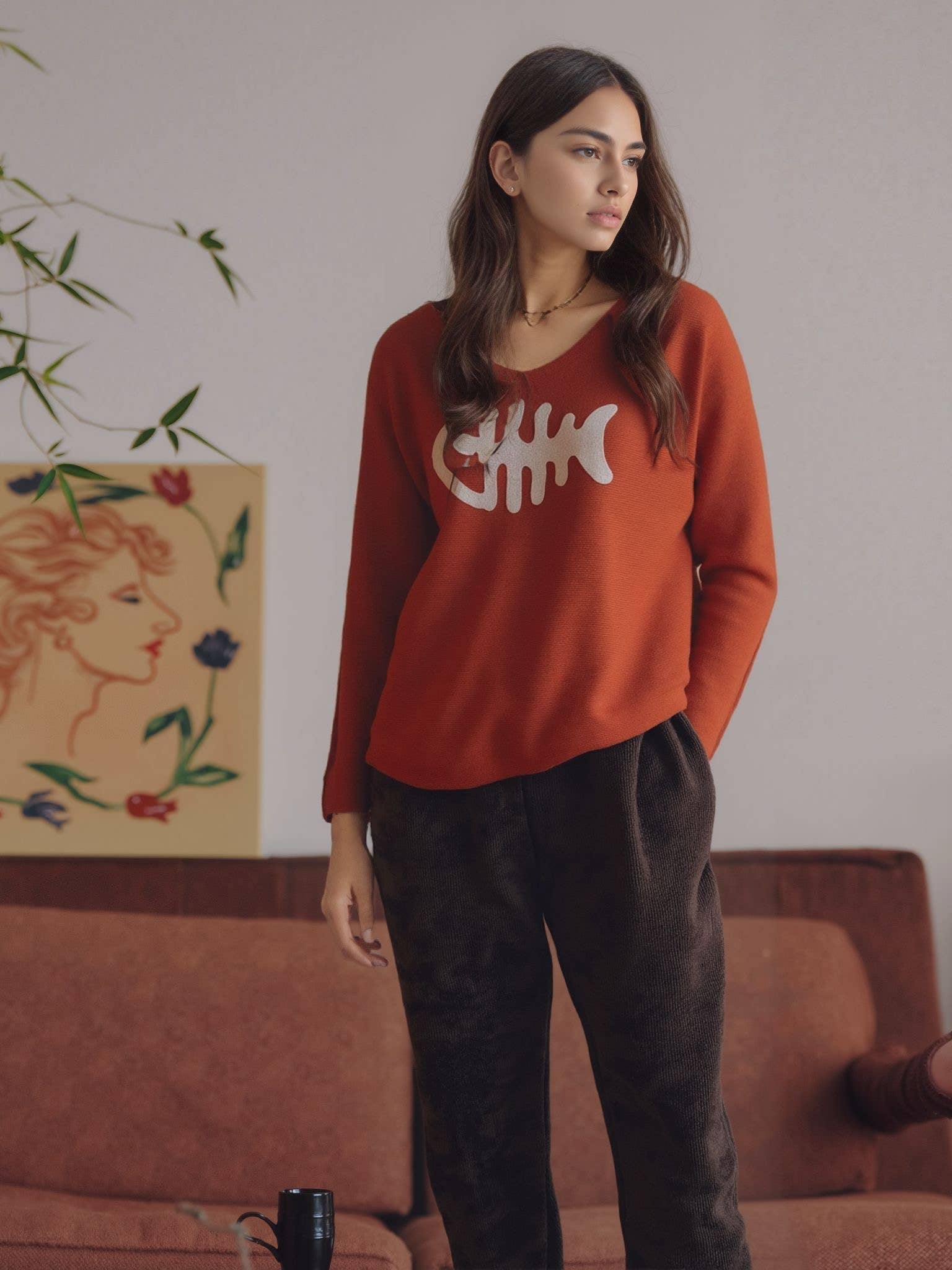 Made from a soft and comfortable fabric, this sweater is ideal for cool days. With its round neck and long sleeves, it offers a style that is both casual and elegant. Its Bohemian flocking completes the ensemble with a touch of tranquility. Perfect for occasions when you want to combine comfort and style with a hint of romance. Length: ~65 cm Chest circumference: ~112 cm Size: ~40-44 For a real idea of the dimensions, please refer to the information above as well as the photos on hangers. The pants are under reference #AH 6601.