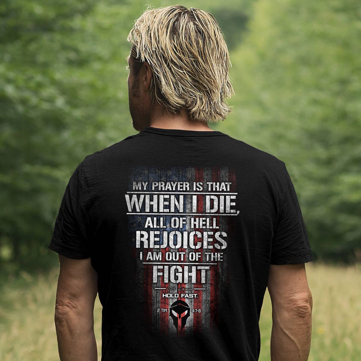 We Will Not Falter™ Proclaim your faith in God and country in this patriotic “We Will Not Falter” HOLD FAST® T-Shirt in Black. We are a nation founded on the principles of liberty and justice for all, and we will not fail in our duty to stand up for what is right. Hold fast to your convictions that faith, family, and freedom are what matter most, and when called upon to stand up for these beliefs, stand up and speak out with courage. HOLD FAST® Adult T-Shirt - We Will Not Falter™ - Color: Black - 100% Cotton, 5.3 oz. - Seamless double-needle 3/4" collar - Taped neck and shoulders - Double-needle sleeve and bottom hem - Tubular fit for minimal torque