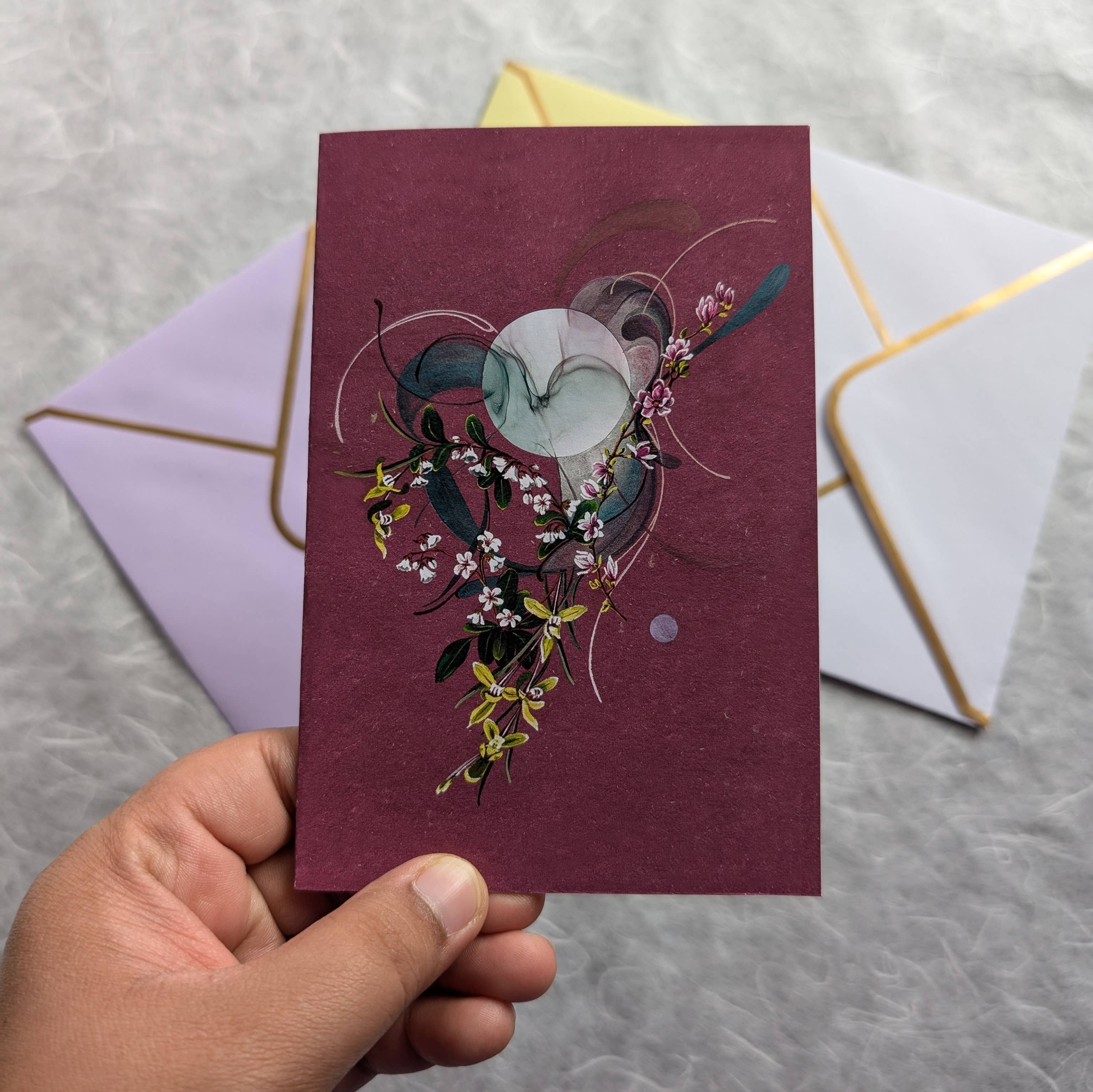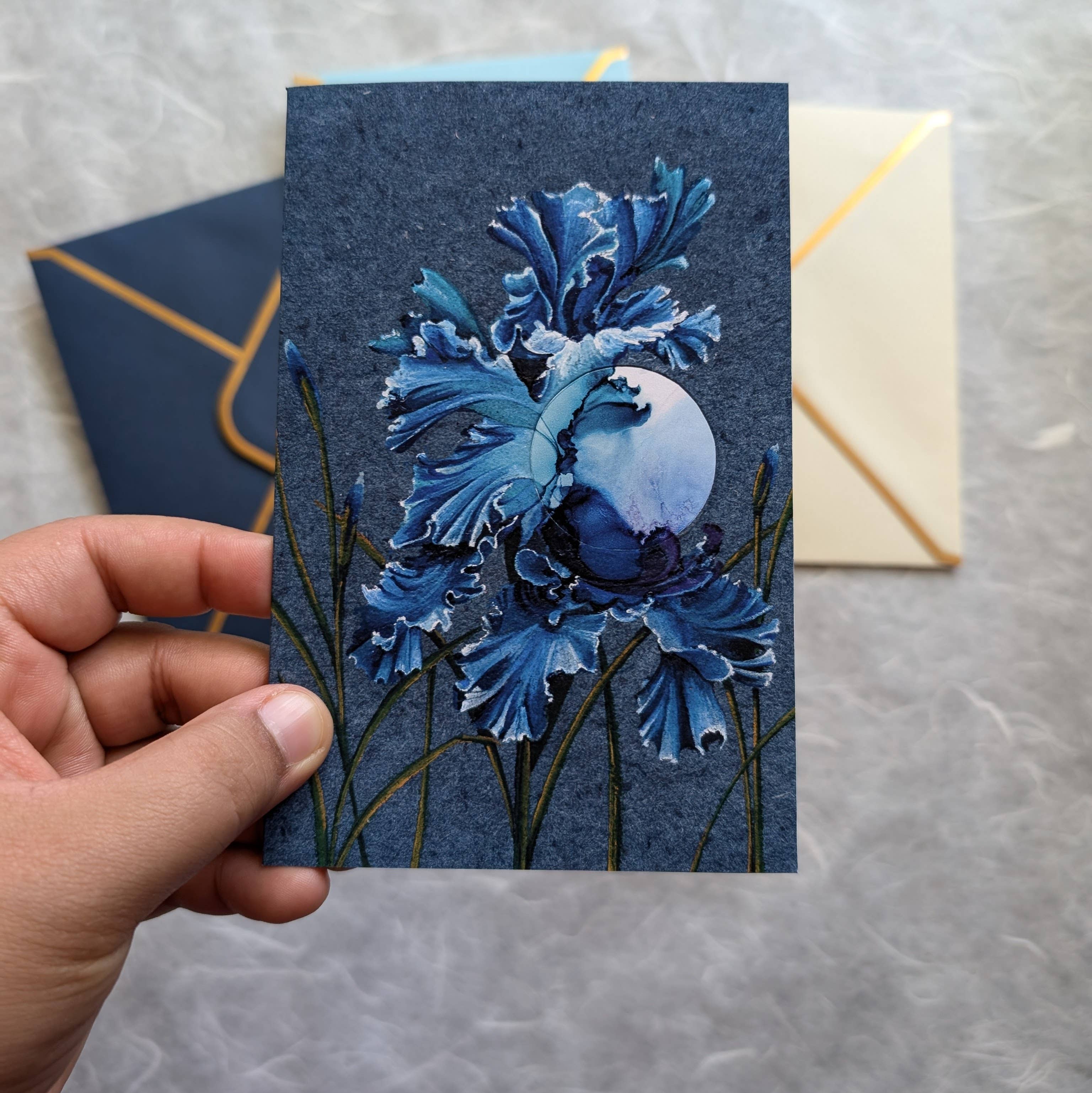 This is a reproduction of the original painting from the collection called 'Open Series' that was done with gouache and embroidery. It has been printed on acid free, heavy 88lb. Polar Matte Paper using a professional fine art printer. This is a greeting card that is 4"x6" in size when folded and 8"x6" in size when opened. The inside of the card is left blank and is perfect for handwritten notes. There is an option of selecting your choice of envelope. Please make sure you choose the correct one in the drop down menu. All greeting cards come with a small info card that describes the artwork. Info Card: Light, airy, and dangling Bleeding Hearts sway on the stems with the moon behind, but at the same time outshining the moonglow with its own.