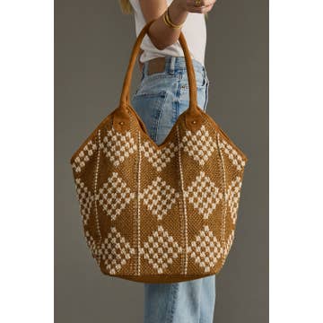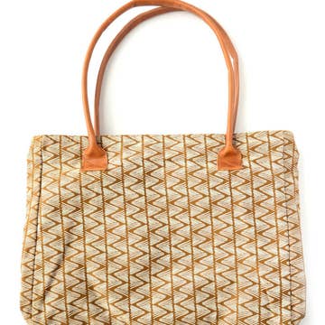 Zig-zagging down narrow dirt paths in a rural town in the Andes mountains-- that's what comes to mind for us with the geometric pattern on our Mountain Paths Purse. This gold and white patterned fair trade bag has a zipper top, three pockets inside, and vegan leather handles. Cute, functional, and ethically made by women in Cambodia. Made from gold-colored cotton canvas, using 100% upcycled materials from waste from traditional garment factories. White pattern screen printed using eco-friendly dyes. Measures 11"H by 14"L by 3.5"W. Learn more about the women who make the bags in our Cambodia Collection.