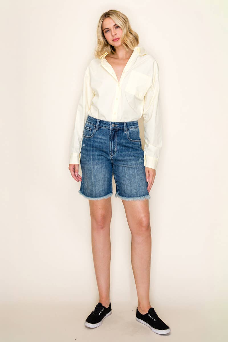 Effortlessly chic, the Judy Blue Mid Rise Tummy Control Vintage Wash Release Hem Shorts bring a stylish and flattering option to your summer wardrobe. These mid-rise shorts feature a tummy control design for a sleek silhouette and all-day comfort. The vintage wash and release hem detail add a trendy, laid-back vibe perfect for casual outings. Pair them with your favorite tank or tee for an effortlessly chic look. The fabric is super soft and feels like a dream. The Tummy Control feels so good giving you maximum comfort and confidence. Sizing: * S: 2-4 * M: 6-8 * L: 10-12 * XL: 13-15 * 1XL: 14W-16W * 2XL: 18W-22W * 3XL: 22W Measurements: * Rise: 11 1/4 * Inseam: 4 1/2" Fabric: * 91% Cotton, 7% Polyester, 2% Spandex