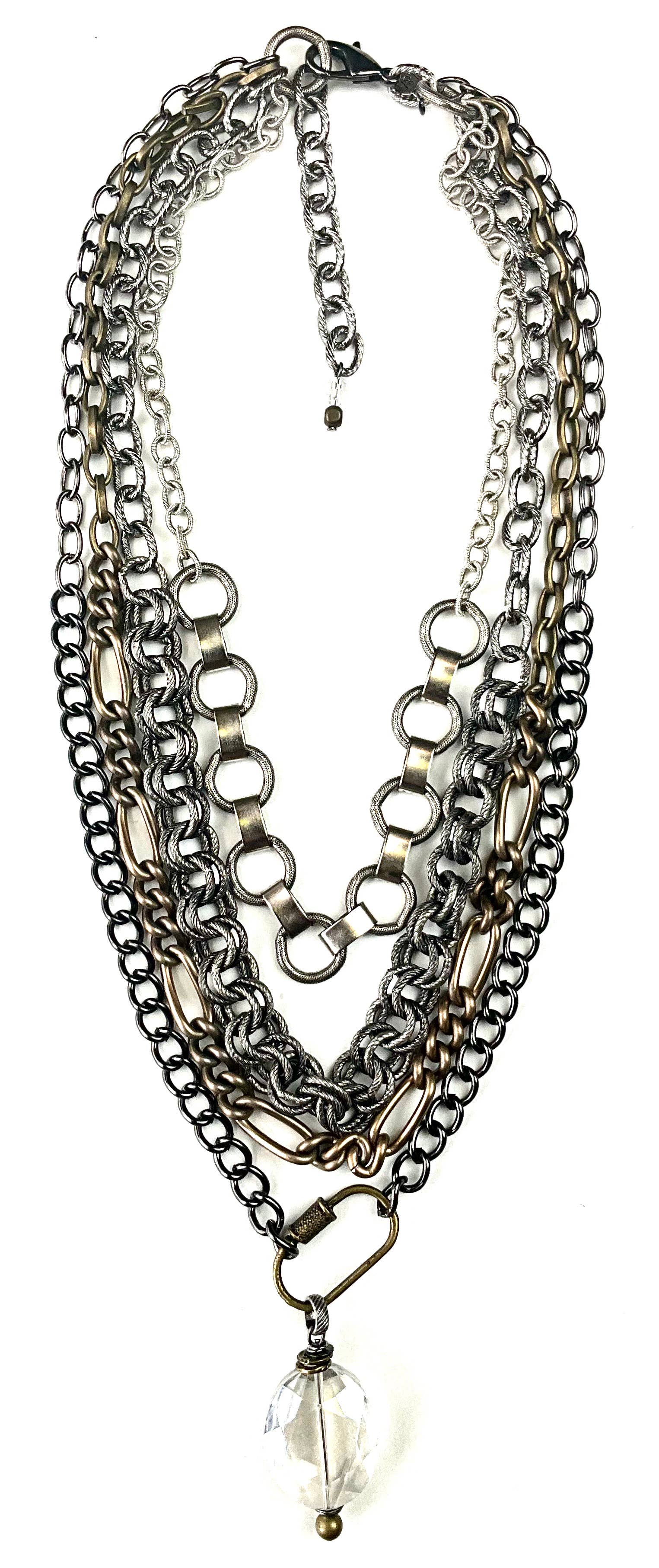 Gorgeous Gunmetal Crystal 32" length necklace This necklace is a mix of metals, gunmetal, antique bronze and lots of different chain detailing. It has a gorgeous crystal teardrop pendant attached to a large gunmetal ring. I have added several mix metal designs that could layer or pair well with this collection. Pairs with Gorgeous Gunmetal Crystal bracelet and earrings Gypsy Junk Originals - Mixed Metal necklace Gorgeous Gunmetal Spike Necklace Matte Gray Diamond bracelet