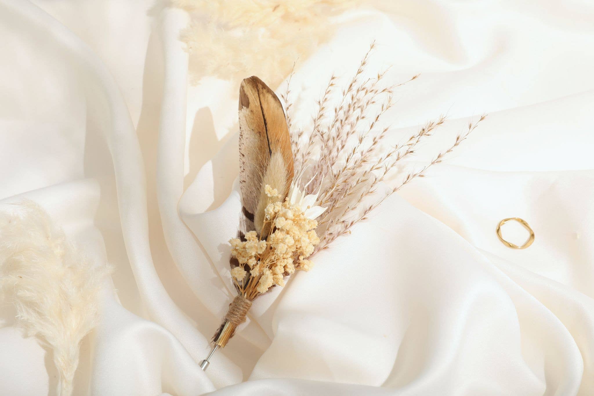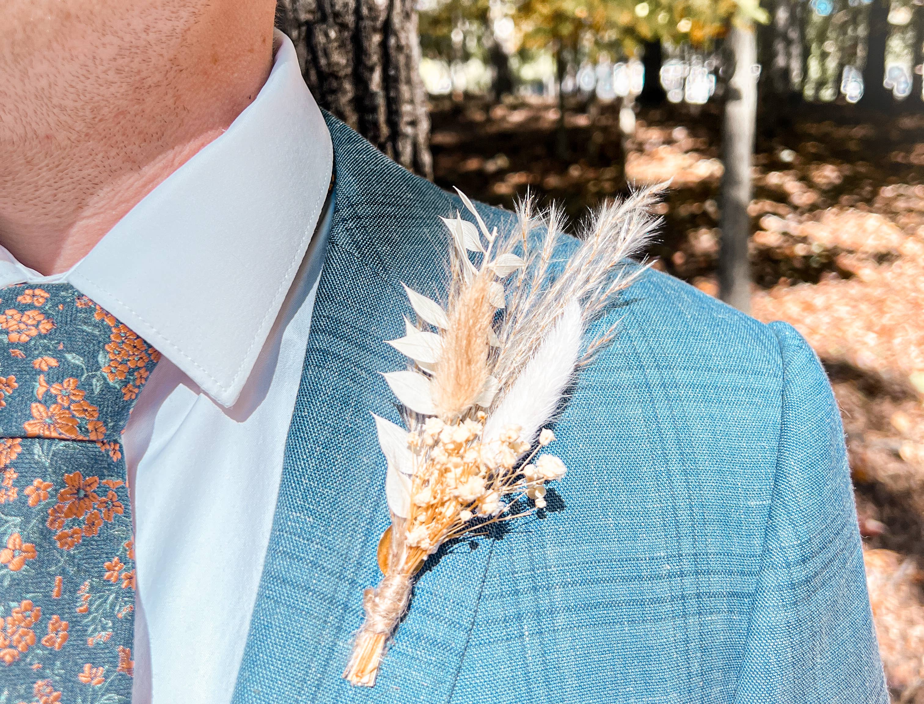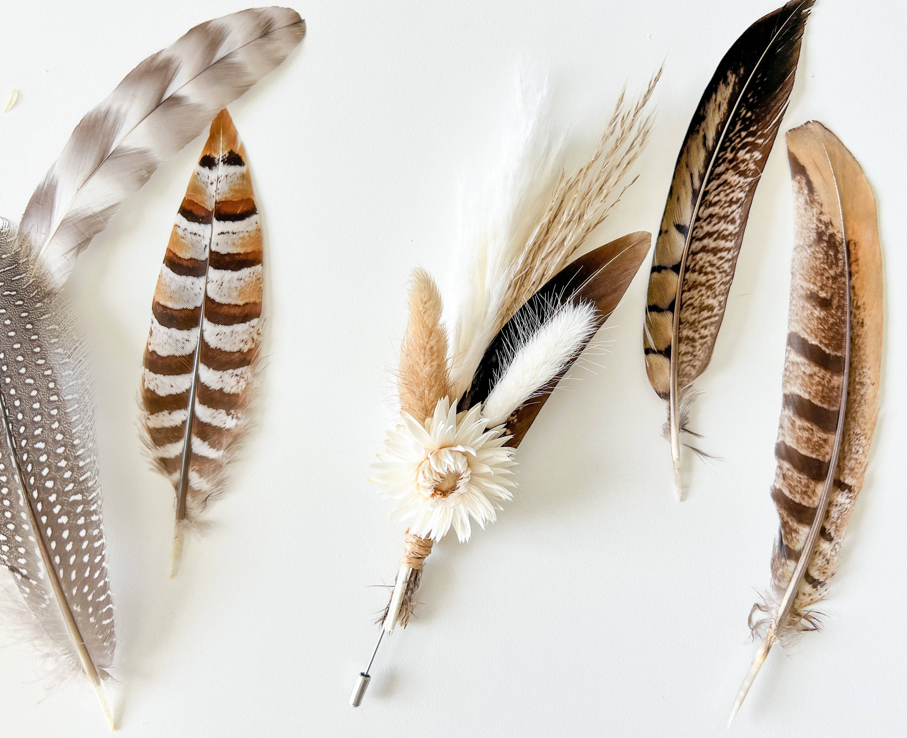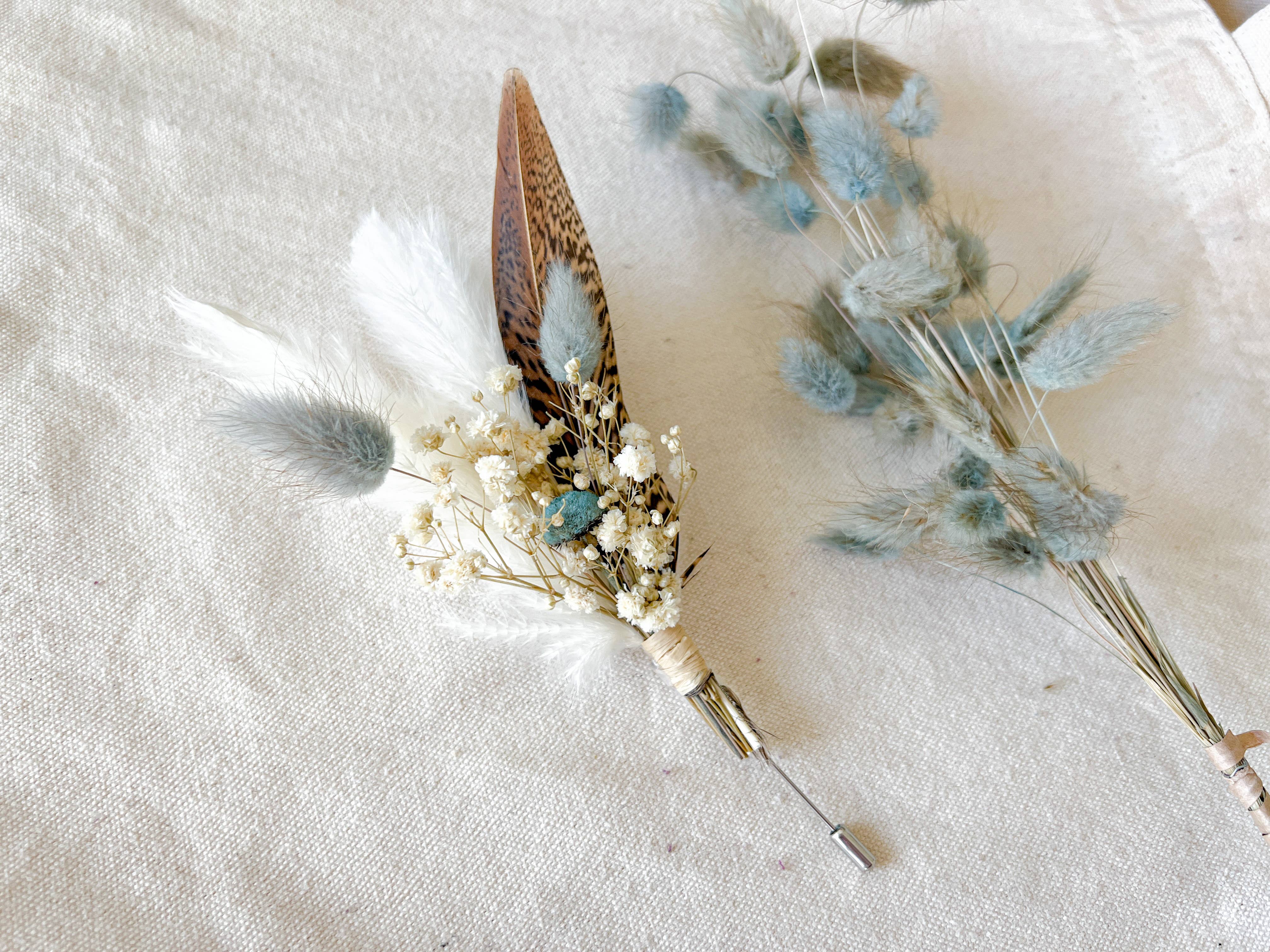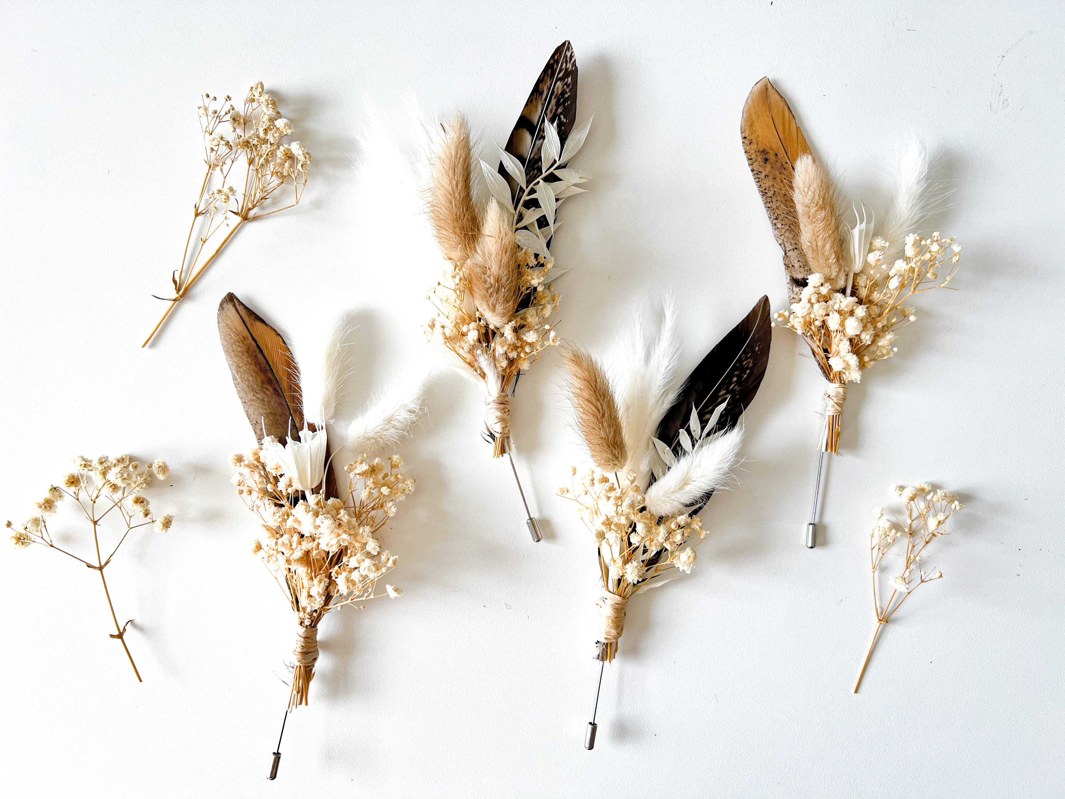 An assortment of neutral boutonniere with bunny tails, feathers, pampas grass, and other dried flowers. Measurements: approx. 5-6", includes stainless steel pin to attach to a lapel or insert into the breast pocket. Made to order. Items ship in 5-7 business days. Please message Courtney for any questions about delivery timelines. Packaging: items are packaged in a cellophane pouch for protection Each boutonniere is handmade and may have slight variations due to natural variations in the flowers and feathers and come individually wrapped. Carefully remove them from their packaging. Keep out of direct sunlight and store in a dry place. Please also note that the listing photos may differ slightly from the actual colors due to the lighting and/or the calibration and color settings of your device.