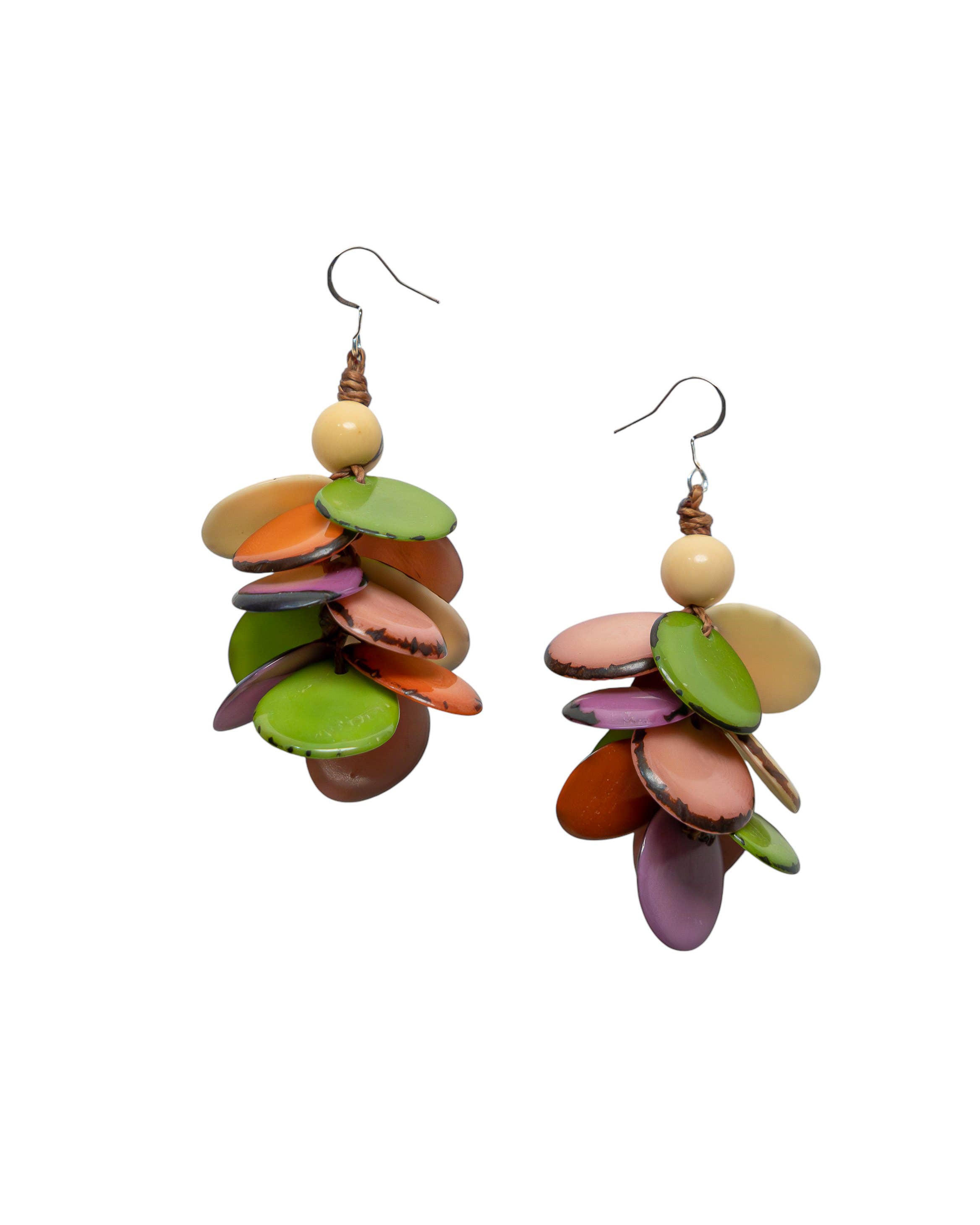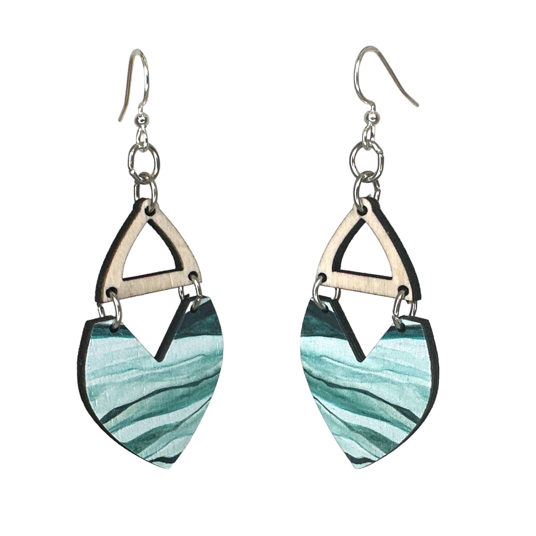 A single strand of round and pyramid shaped wood beads in beautiful graduating colors; Ivory sand, warm haze, kiwi green, pacific palisades teal, azure blue and dark blue the color of the evening sky hanging 2" from a stainless steel hook. • Please note that the earring stand is 4-½" tall.