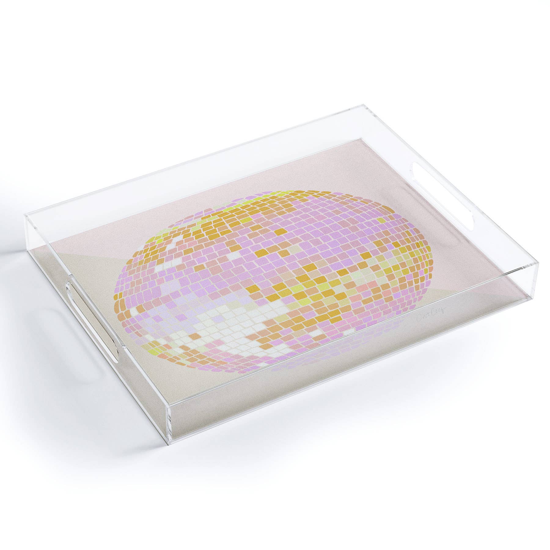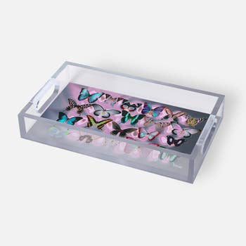 Tray chic. The Deny acrylic trays come in a small and medium-size to accommodate all your countertop organizational needs. Featuring designs from our curated selection on the bottom panel, the acrylic trays can adapt to whatever decor style you love and the see-through side panels give them a modern flair. The medium-sized tray even comes with handles, allowing you to take it around the house for nail supplies or, dare we say, breakfast in bed! And the best part? Every purchase pays the artist who designed it—supporting creativity worldwide. Small Size: 8" x 6 1/4" x 1" - No side handles Medium size: 15 1/2" x 12" x 1 3/4" - Has hand holes for easy carrying Artwork featured on bottom panel Includes feet to avoid scratching surfaces Estimated ship date: 5 business days Every order custom printed in the USA