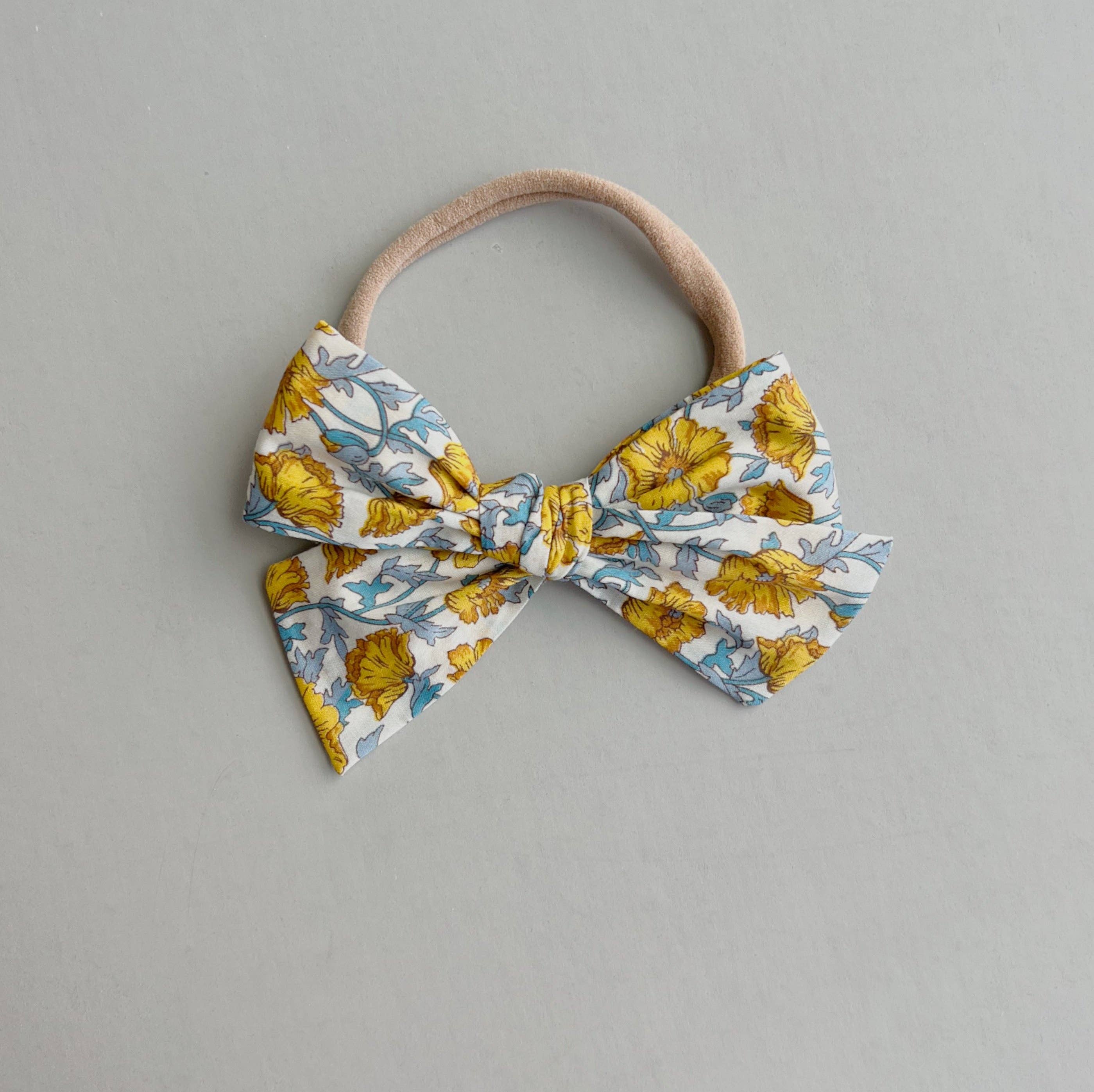 Gilli Liberty - Cotton Schoolgirl Bow Our cotton bows are made to withstand the wild babes that wear them. Each bow is hand-sewn, pressed, tied, secured and then attached to either an alligator clip or one-size fits all nylon headband Fabric is 100% Egyptian cotton + is super soft and hand tied with love + guaranteed 100%. Xxoo